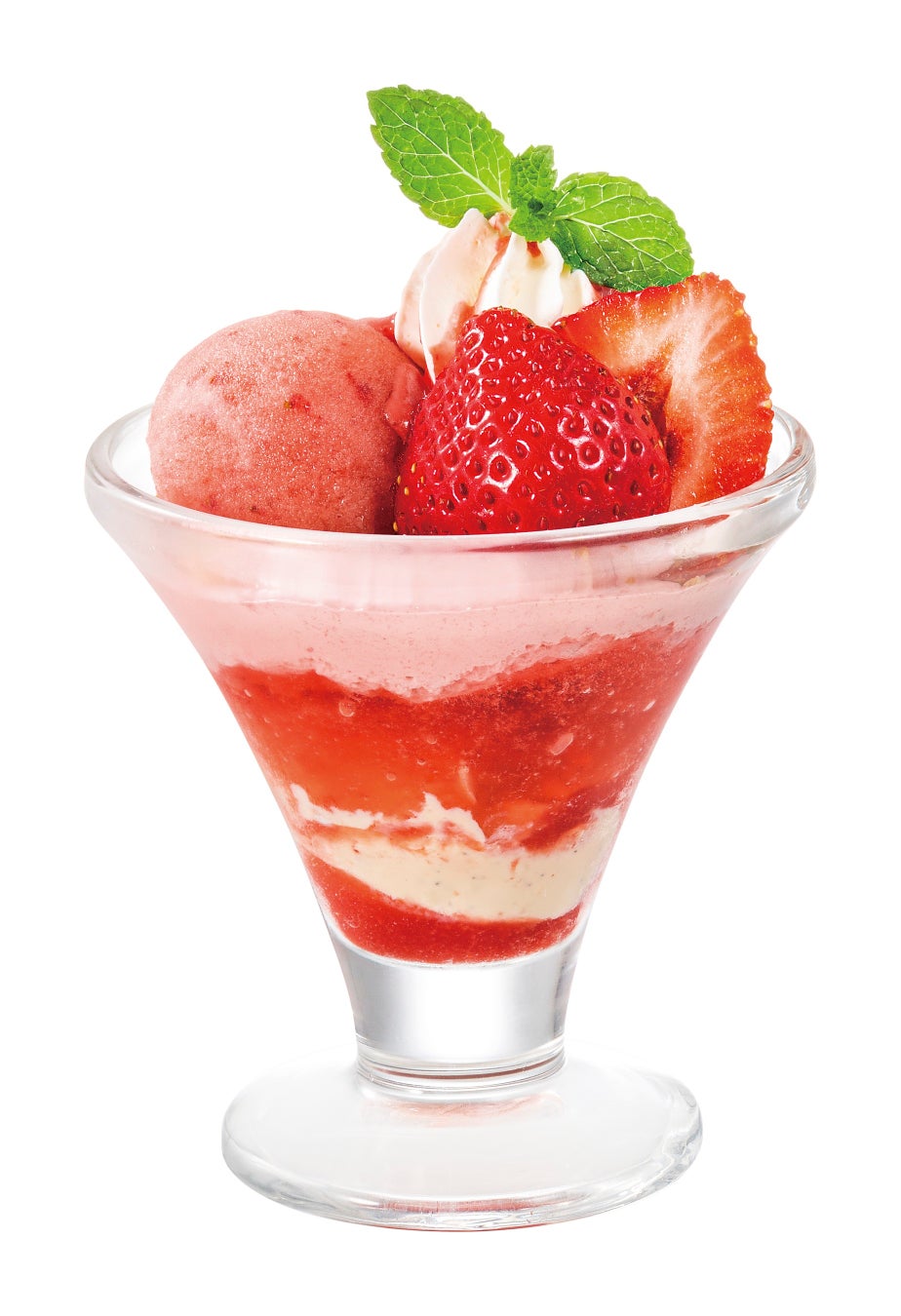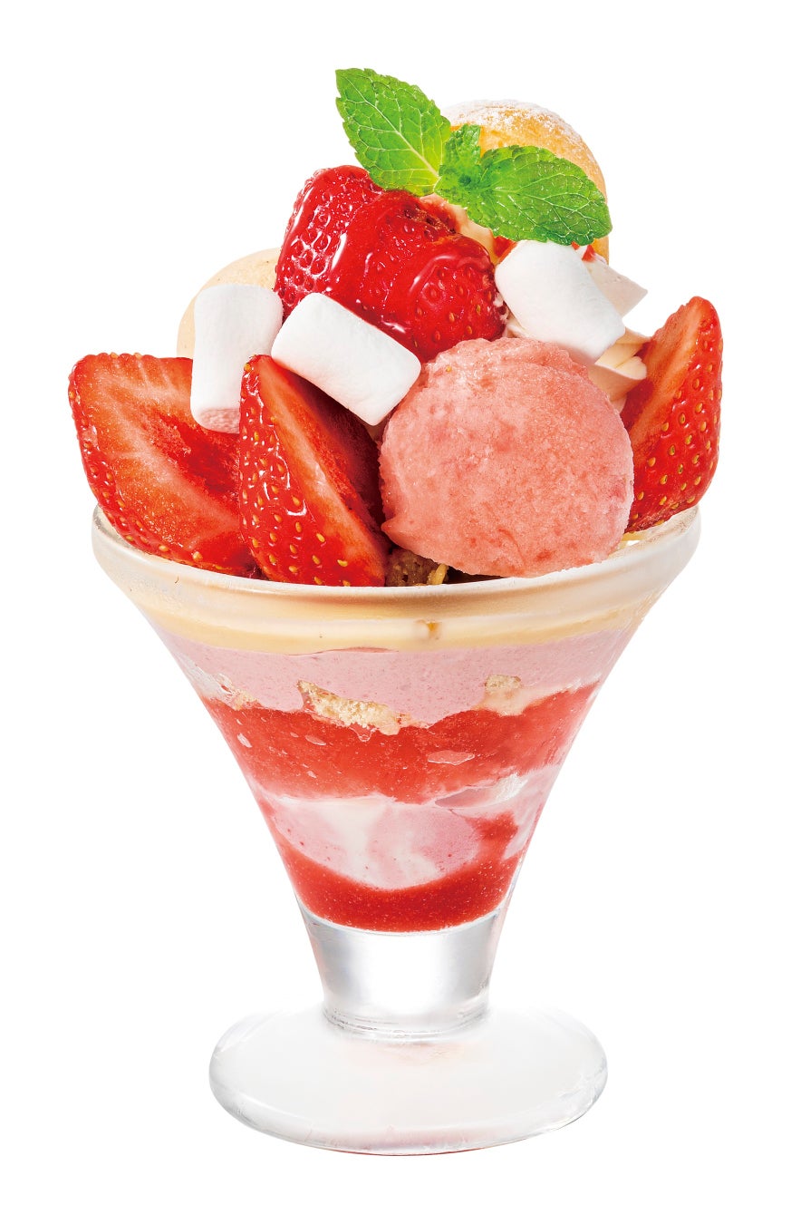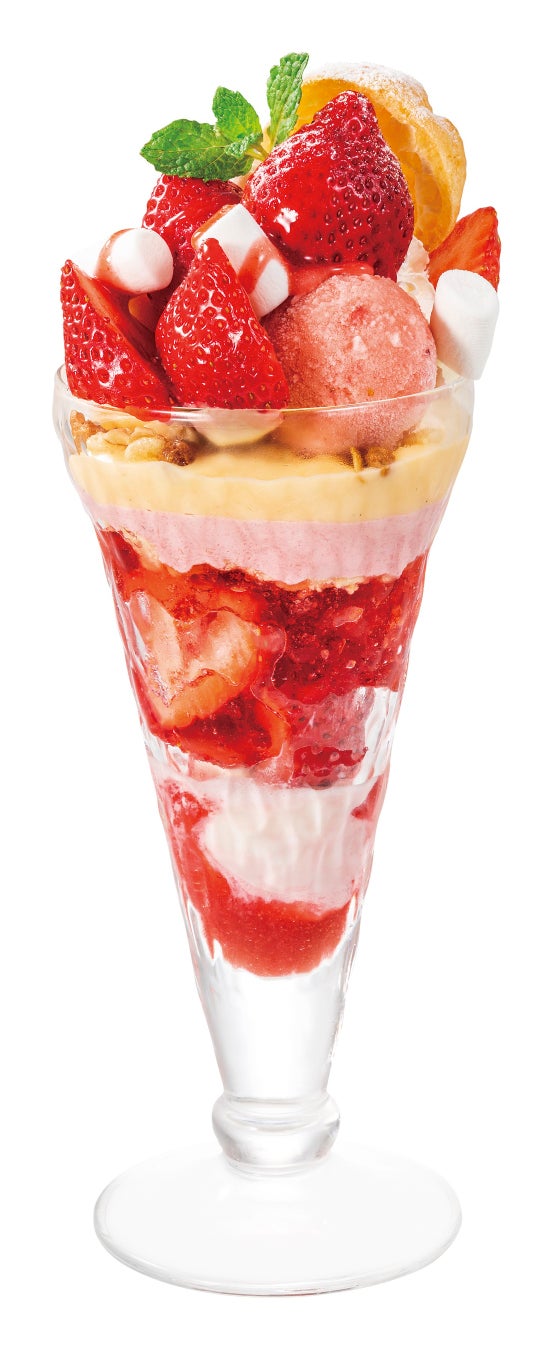 まずは、いちごソルベやいちごクリーム、いちごゼリーなどイチゴたっぷりのサンデー。シューやマシュマロを飾っている。