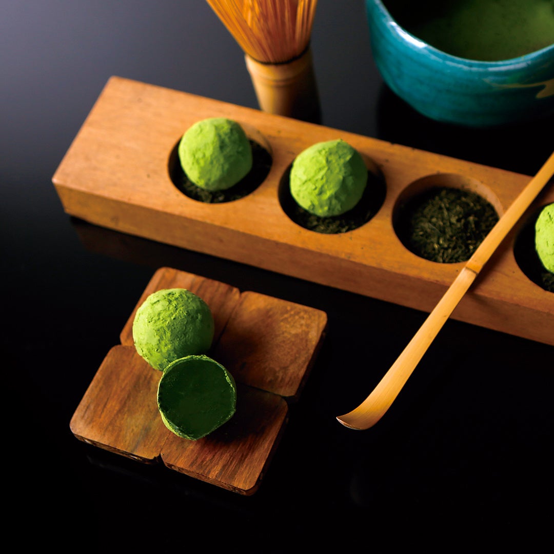 「五感 京ノ葉 抹茶トリュフ」は、鷲峰山の麓で栽培され、寒暖差が激しいが故に香り高い「山の茶」と呼ばれる茶葉を石臼で挽いて仕上げた抹茶を採用。滑らかな口あたりのガナッシュに練り込んだ。柔らかい甘みと抹茶の爽やかな苦味が好相性のトリュフだ。