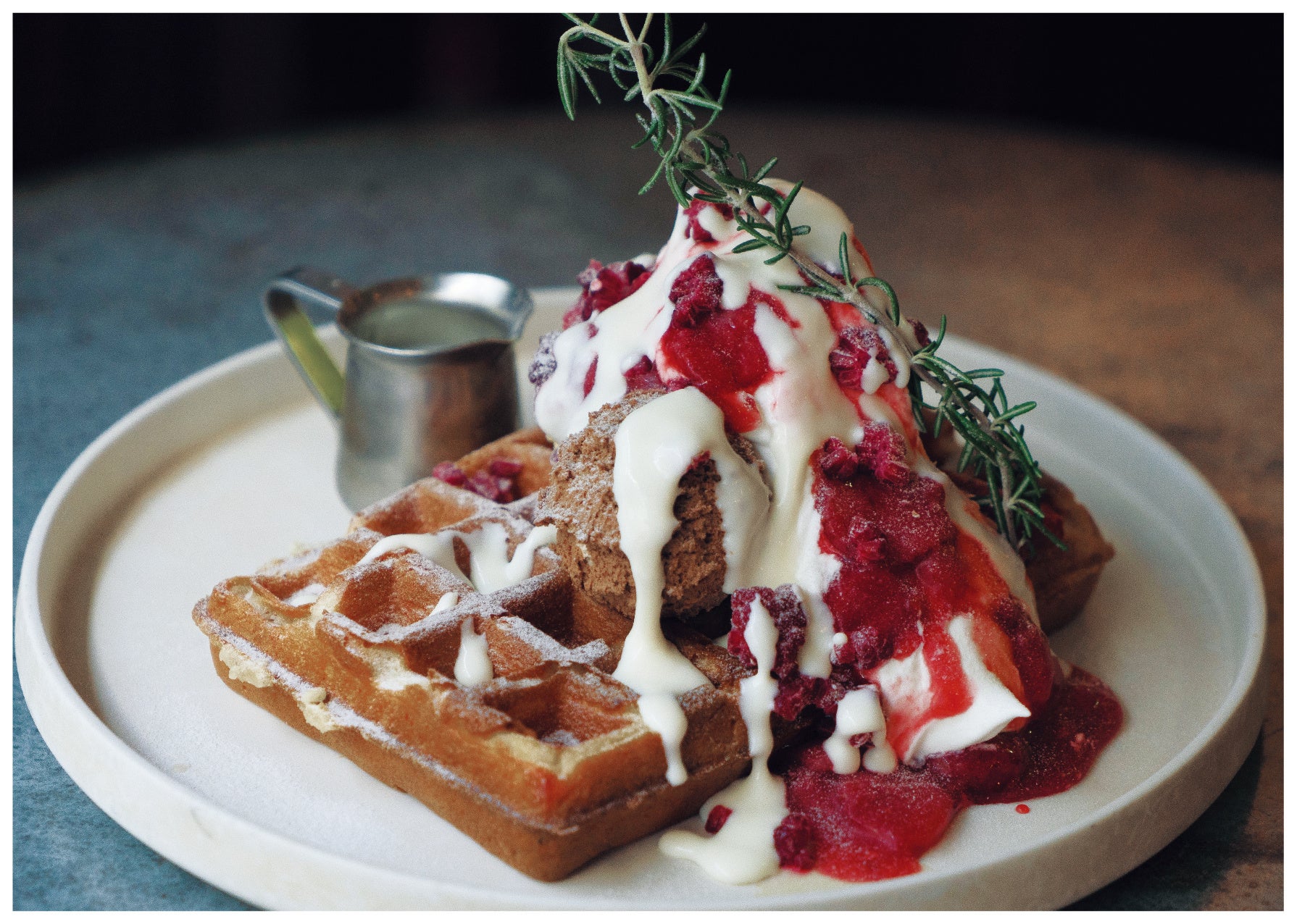 焼きたて熱々のワッフルと冷たいアイスの“アツひや”が奏でるハーモニー。別添えのホワイトチョコクリームをかければ、甘さもアップする一度でさまざまな味わいを楽しめる一品だ。