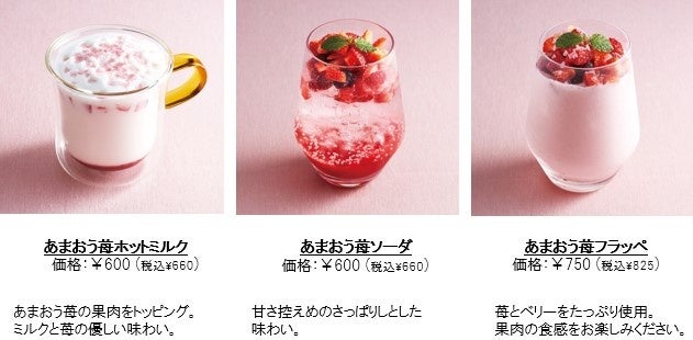 同フェアでは、フレッシュな「あまおう苺」をふんだんに用いたデザートとドリンクを提供。あまおう苺のパンケーキは、マスカルポーネクリームの味わいが特徴の一品だ。当フェア限定のドリンク3品にも、フレッシュなあまおう苺をふんだんに用いている。
