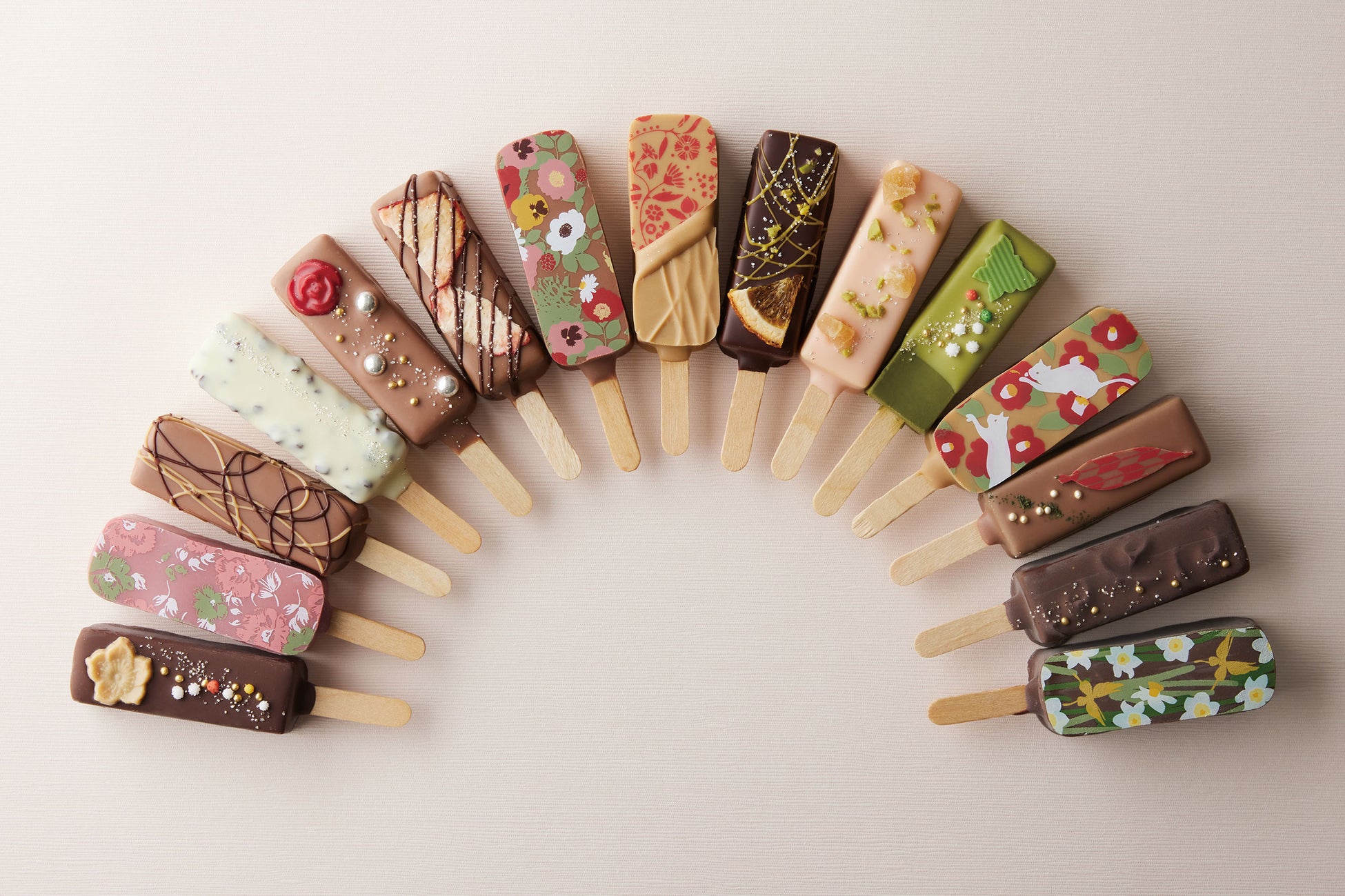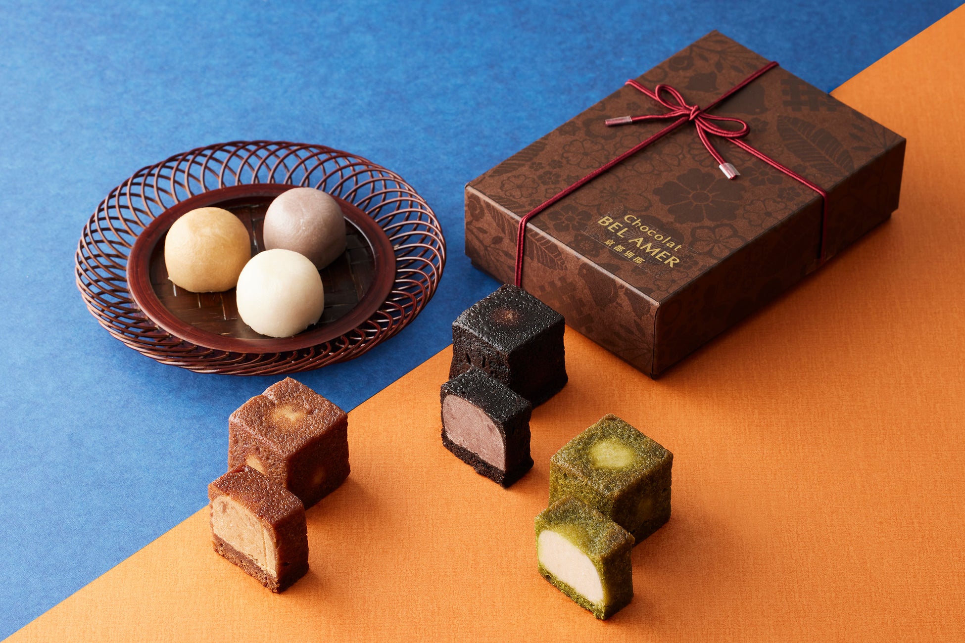 テクスチャーの異なる「ガナッシュ」「キャラメル」「プラリネ」を閉じ込めた「彩ショコラ」は、毬や花などをモチーフに仕上げた。ショコラとフルーツや金胡麻、茶などを組み合わせ、和素材が引き立つ全12種の味わいを提供する。