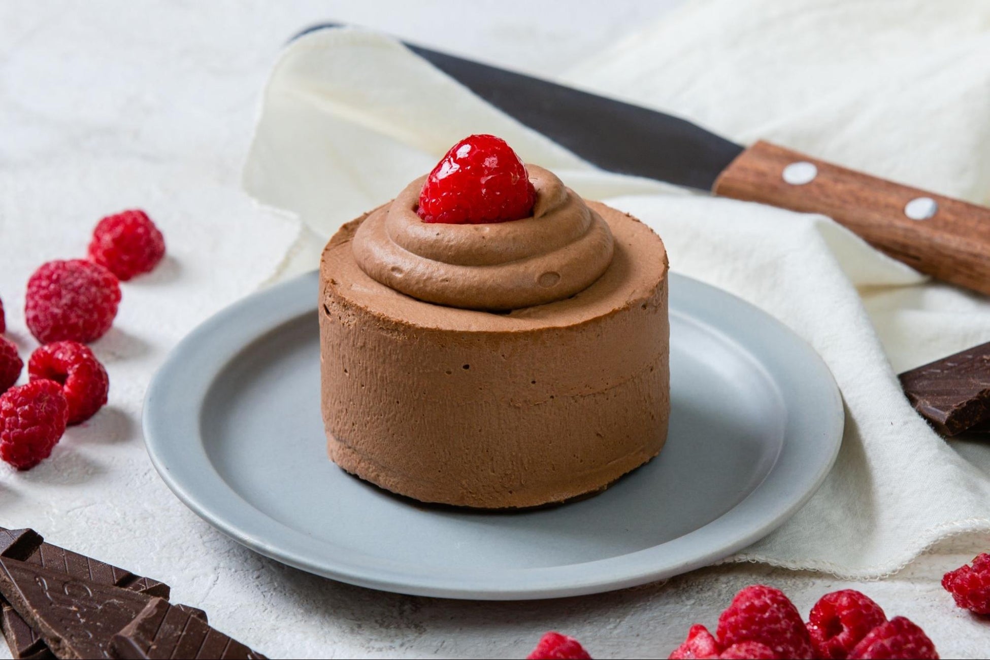 「ラズベリーのチョコレート」は、「オレンジのチョコショート」同様、カカオ73%と99%の高カカオベルギー産チョコレートをたっぷり配合したビターなチョコレートクリームに、甘酸っぱいラズベリーを合わせた。洋酒は用いず、生乳、チョコレート、砂糖のみで仕上げた濃厚チョコレートクリームだ。こちらは「オレンジのチョコショート」と2個セットで提供する。