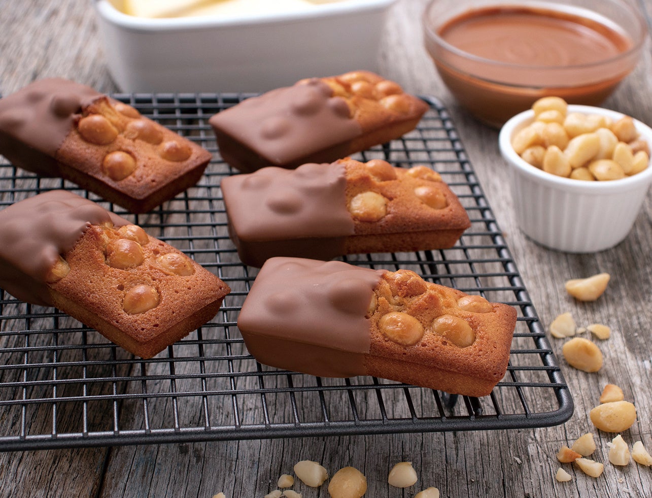 「焼きたてフィナンシェ(マカダミアショコラ)」は焼きたてフィナンシェにヴィタメールの人気スイーツ「マカダミア・ショコラ」と同様のベルギー産クーベルチュールチョコレート2種類をブレンド。味わい深いチョコレートとマカダミアナッツの組み合わせは、チョコレートの口どけと香ばしいフィナンシェの食感が両方味わえる。