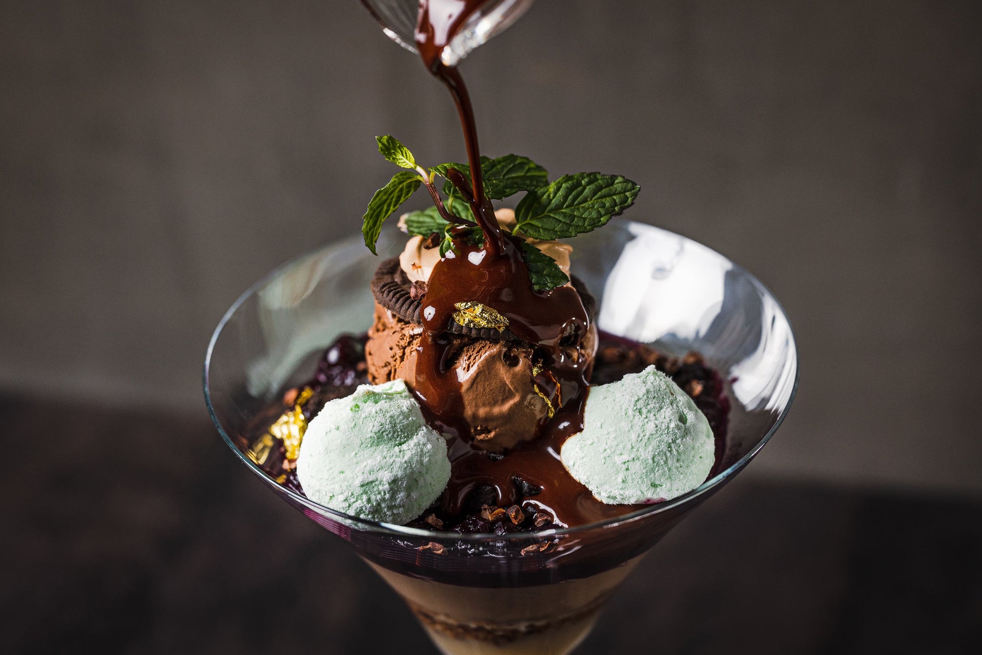 ギニア湾の中心に位置する火山島からなるサントメ・プリンシペ民主共和国で生産されるグラン・クリュのカカオ豆から作られるナッティでフルーティな香りをもつチョコレート「チロリ」を採用。ミントの香りを詰め込んだクリームとブルーベリーのコンポートがマリアージュを生む。やわらかな食感の特製生マシュマロとサントメ・プリンシペ産のチョコレートを用いて、まるでスモアを感じさせるパフェに仕上げた。
