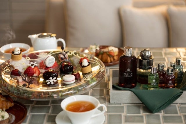1日5組限定の「“Molton Brown” Neon Amber Afternoon Tea」は、モルトンブラウンのフレグランス「「ネオンアンバー」をイメージしたアフタヌーンティープレート。フレグランスのもつ甘さと情熱を彷彿とさせるスイーツやセイボリー全10種類の華やかなプレートがモルトンブラウンの世界観を演出する。6種類のティーフリーフローつきで、「ネオンアンバー」の香りのバス&シャワージェル30mlをプレゼントする。価格は消費税・サービス料込みで9,680円。