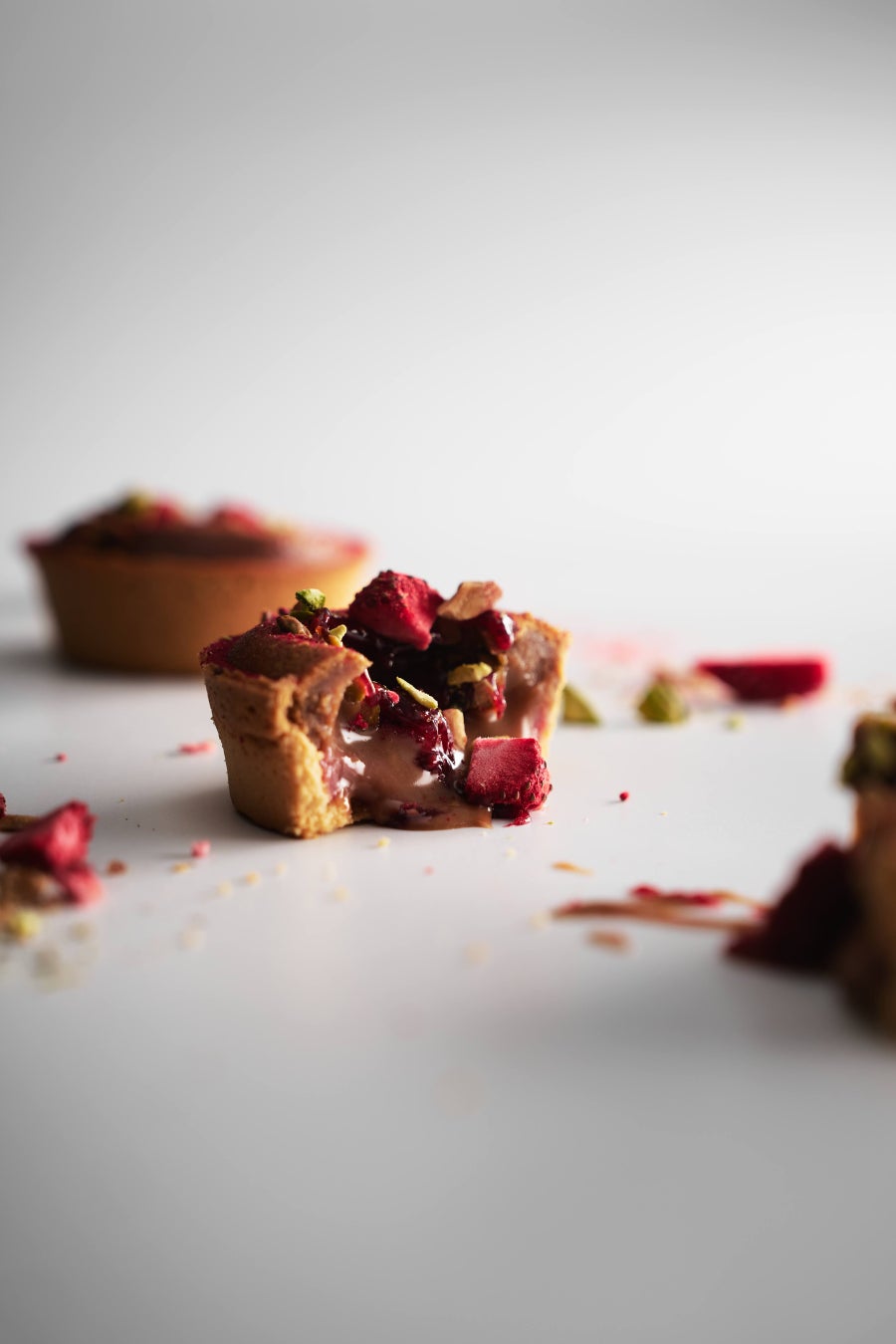 アーモンドやピスタチオ、フリーズドライ苺を散りばめてたタルト。中には甘酸っぱい苺のガナッシュ、ショコラオレとフランス産のクリーミーで風味豊かなクリームチーズを合わせたフォンダンショコラ。最後にフランボワーズのコンフィチュールを絞り、チョコレートの香りや甘さを引き立てている。