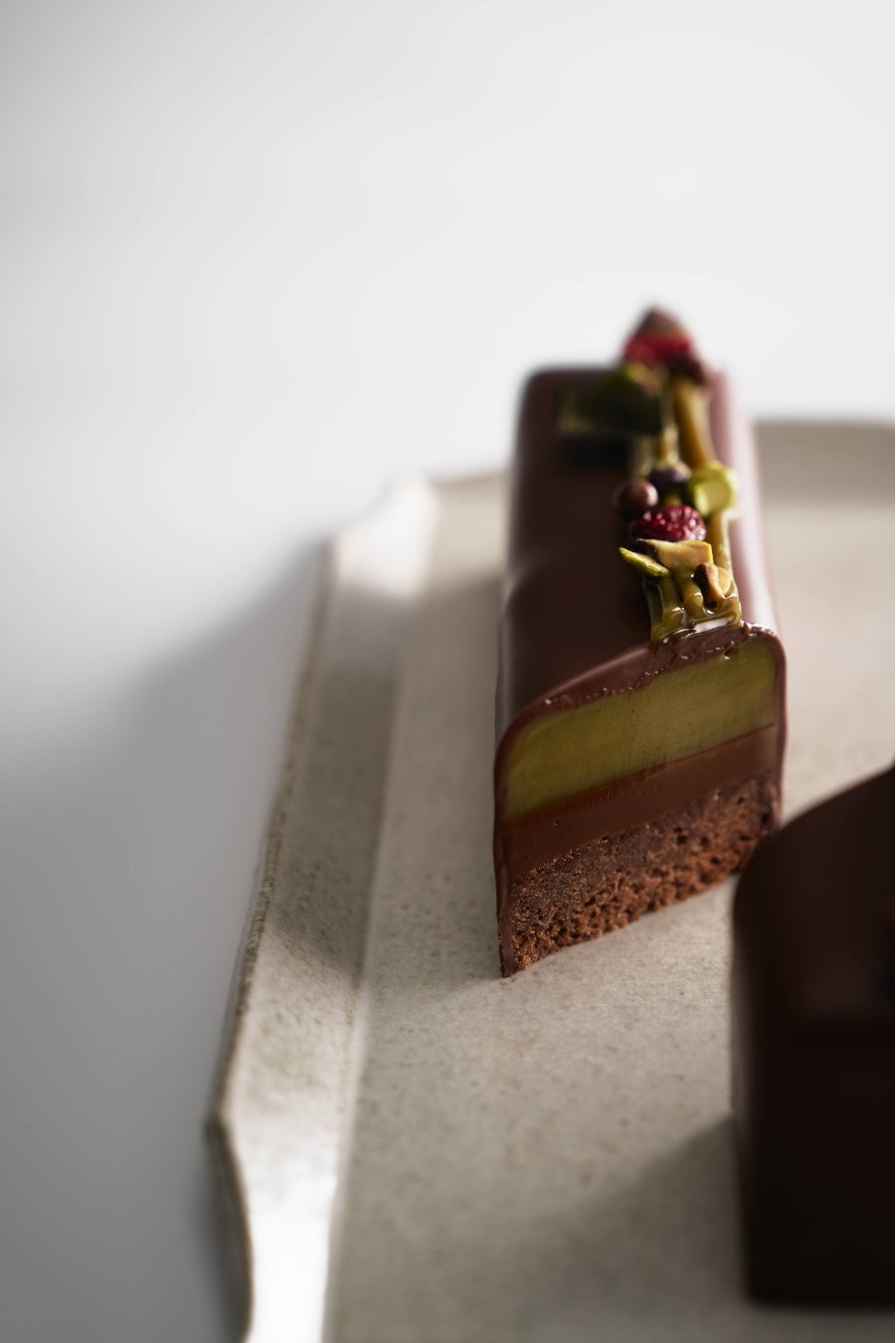 ショコラを感じるしっとりしたブラウニーと香り高くコクのあるピスタチオのガナッシュを重ね、ノワールショコラで包んだ。間にしのばせたキャラメルが、濃厚ショコラとピスタチオの味わいを一層引き立てる。