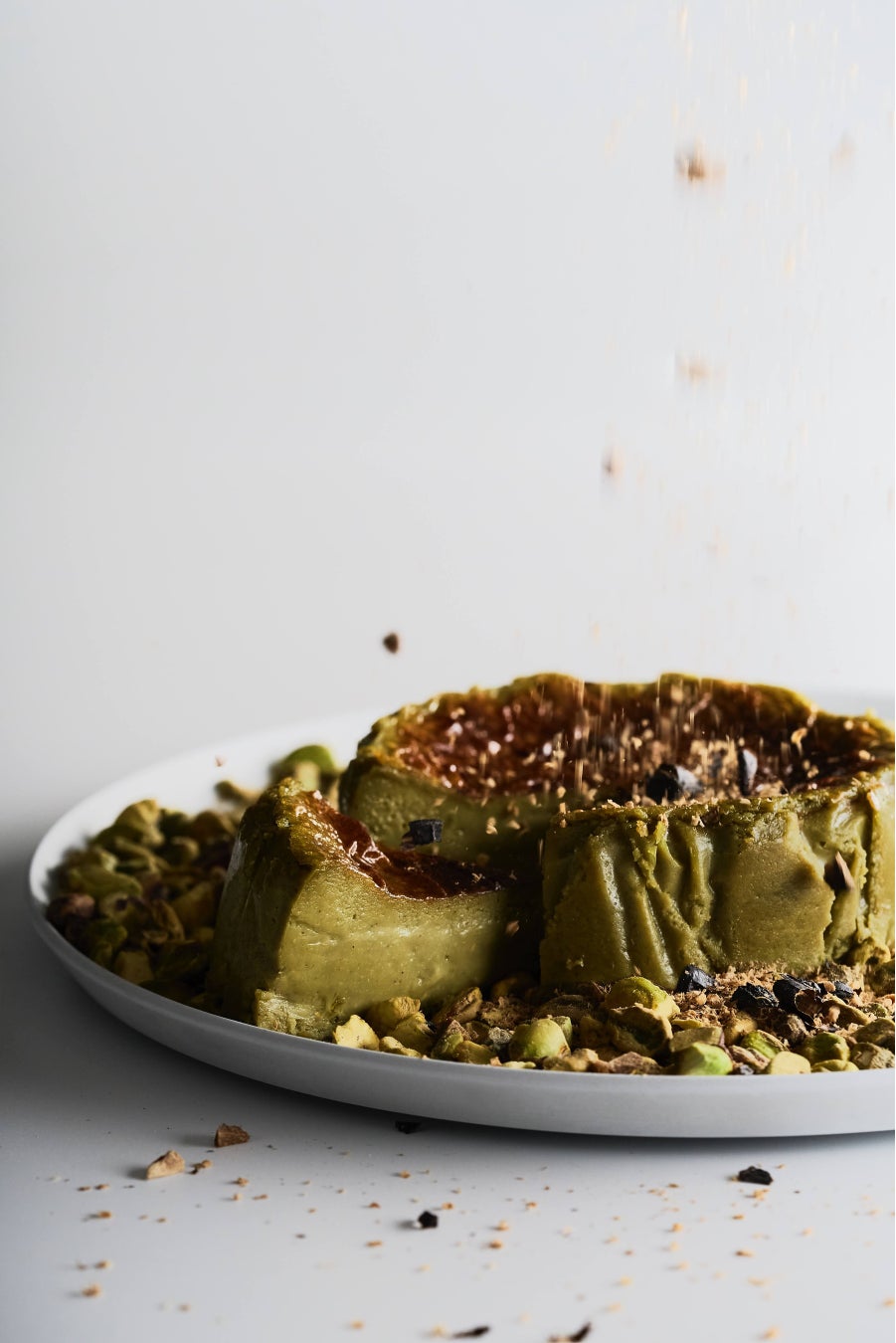 2年に1度しか収穫されないシチリア島ブロンテ産ピスタチオをふんだんに採用。トンカ豆の香りをまとわせたショコラブランとクリームチーズを合わせ、高温で一気に焼き上げて中心をレアな食感に仕上げた。