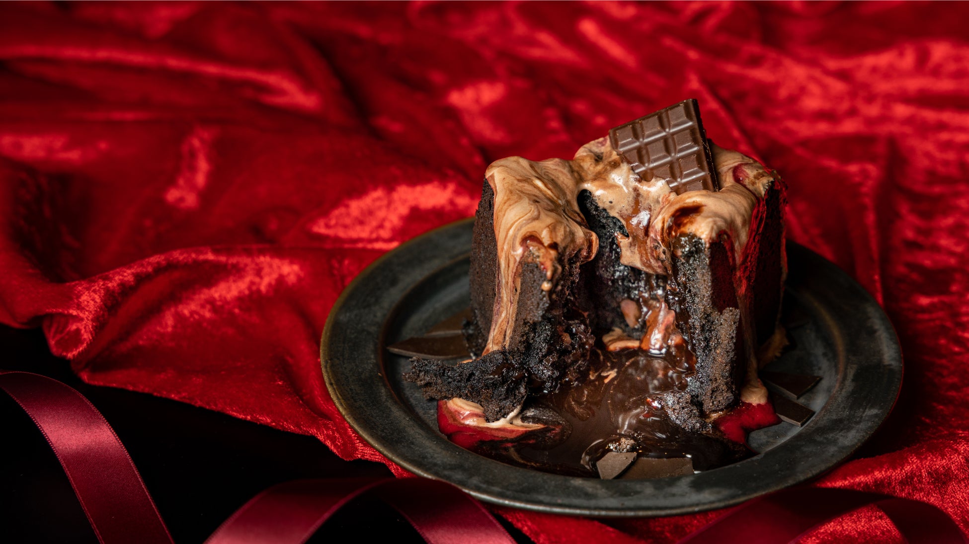 今回のバレンタインは大切な人への熱い思いをフォンダンショコラで表現。プレゼントの箱をイメージしたチョコレートケーキを開けると、中からチョコレートとベリーソースがとろけ出す。甘酸っぱいベリーと濃厚なダークチョコレートが好相性な味わいと、洗練された見た目で“甘すぎず大人っぽい”バレンタインを演出する。