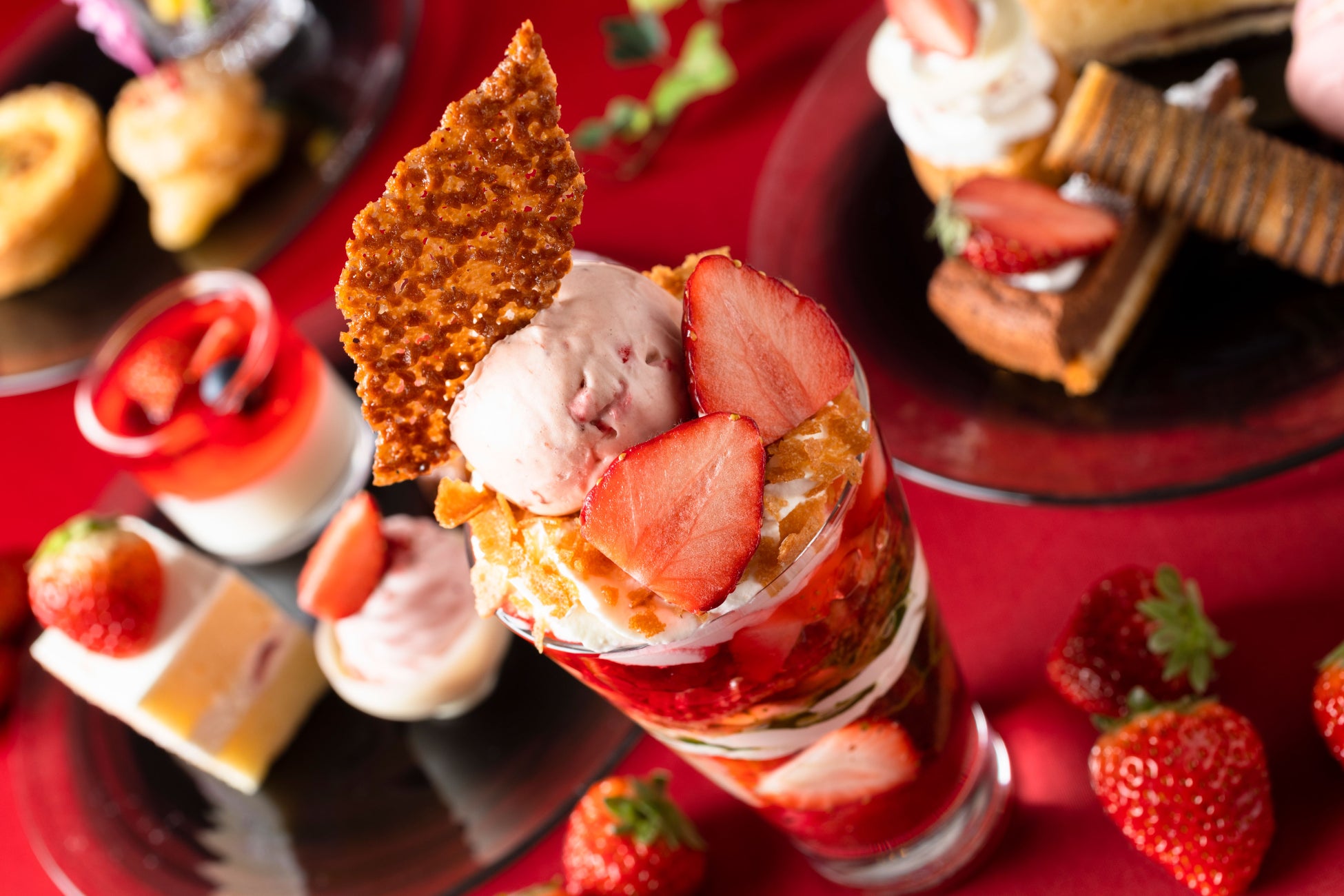 バランスの良い甘味と酸味のイチゴ「あまおう」を用いたアフタヌーンティーセットは、「あまおうパフェ」や「あまおうモンブラン」など、丁寧に仕上げた。ドイツの老舗紅茶メーカー「ロンネフェルトティー」(7種)とコーヒーをフリーフローで提供する。