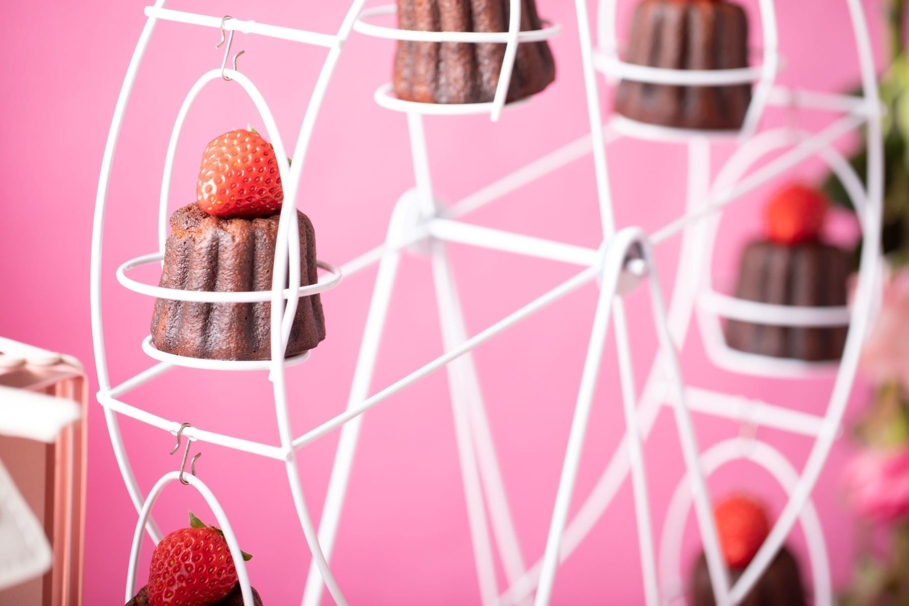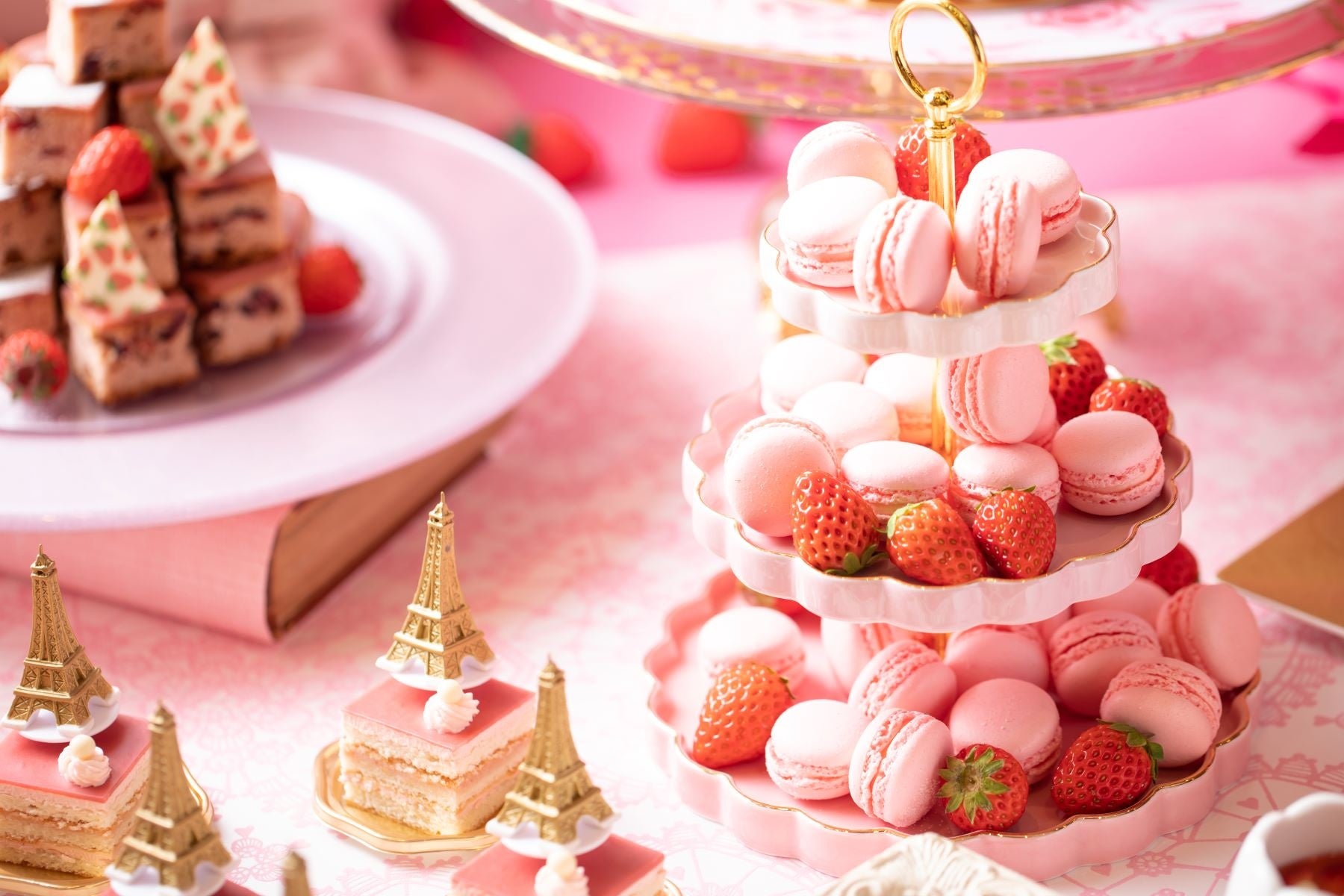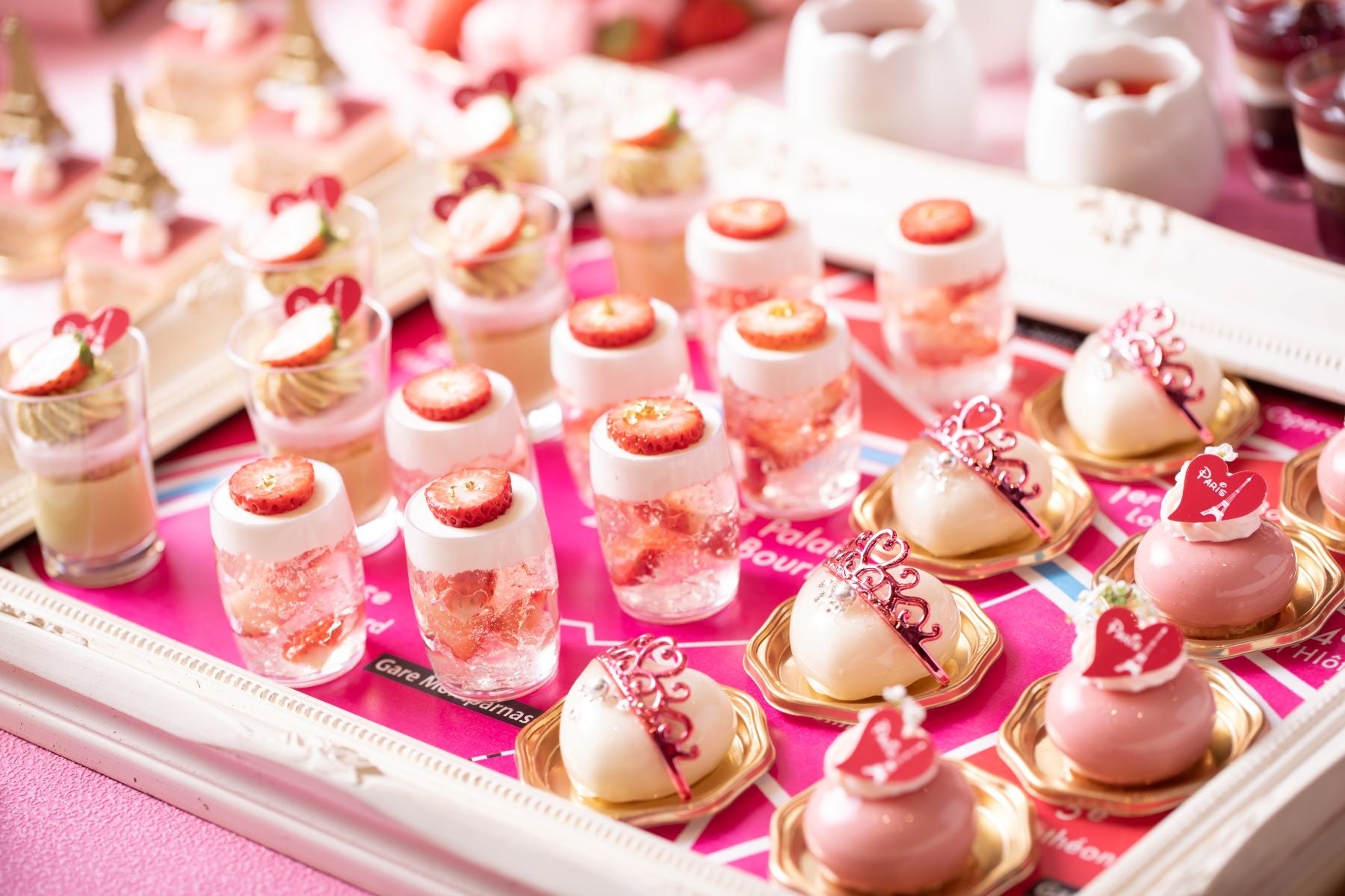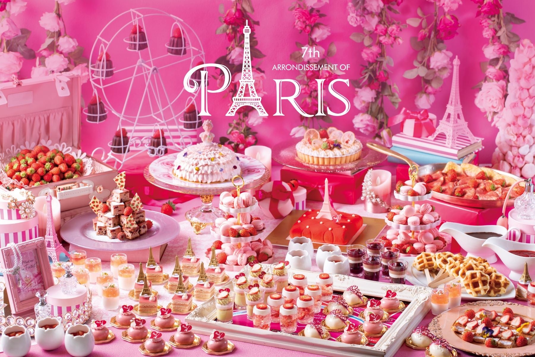 今回はイチゴとチョコレートをテーマに、18種類のスイーツと料理長が手がける6種類のフードを楽しめる。テーマは「パリ7区」として、「エッフェル塔」や「フランス菓子」をモチーフにしたキュートなスイーツを揃える。
