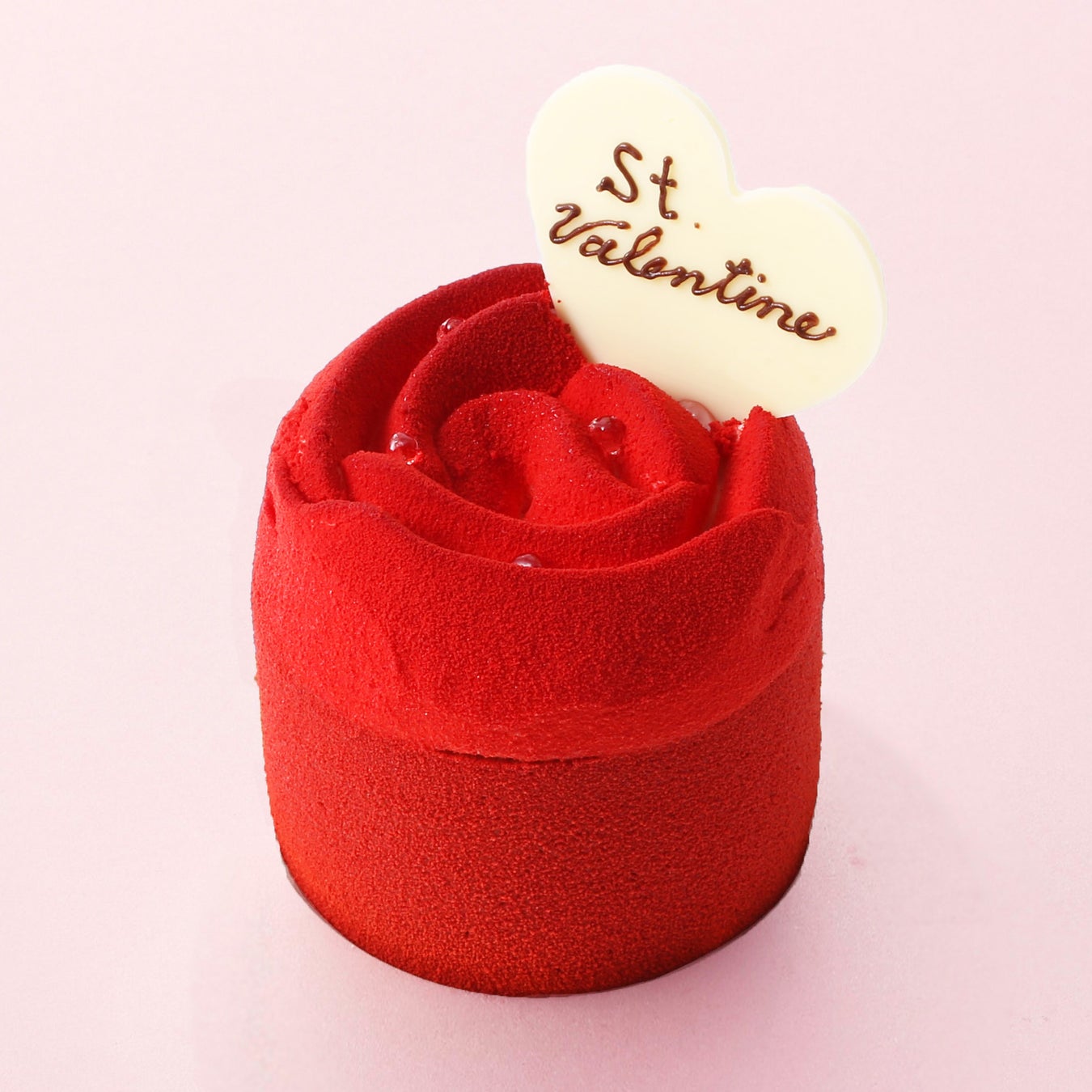 「華ごころ(はなごころ)-ローズ・ショコラ・フランボワーズ-」はコクのあるショコラムースに甘酸っぱいフランボワーズジュレを包んだ上に、ローズの香りのフロマージュクリームを絞ったバラ風のバレンタインケーキ。期間限定で、ハート型のチョコプレートに好きなメッセージを入れられる。