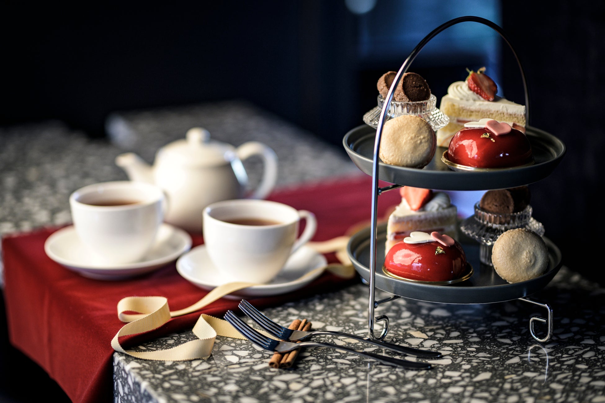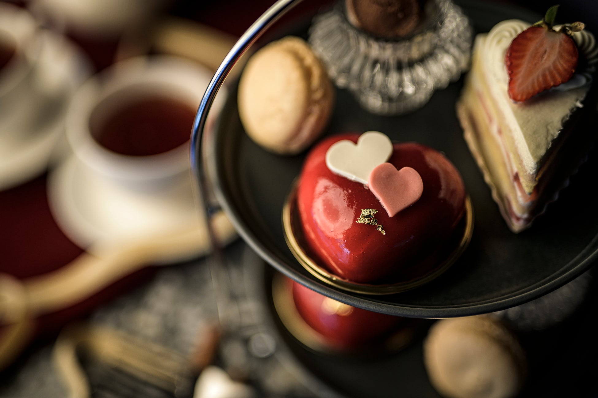 今回のバレンタインアフタヌーンティーには、ハート形のプチガトー、ショートケーキ、バニラ風味のマカロン、発酵バターを用いたチョコレートクッキーの4種が楽しめるアフタヌーンティーを展開する。ホテルセレクトの紅茶やスパークリングワインと共に堪能できる。