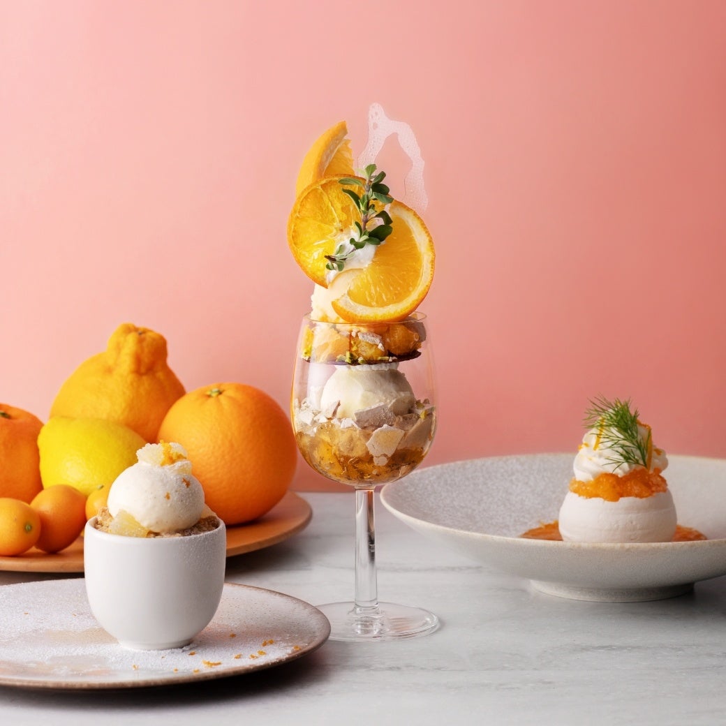 今が旬の柑橘を主役に、多彩な品種を試すことができるコースを用意。柑橘の爽やかさと清々しさを楽しむプレート、温度差と香りを感じるプレート、メインの「伊予柑パフェ」は多彩なパーツを組み合わせ、香りと食感の対照を楽しめる。コースで使われている「デコポン」「国産ネーブル」「愛媛産の伊予柑」「金柑」「国産レモン」の5種類の個性豊かな味わいに注目だ。