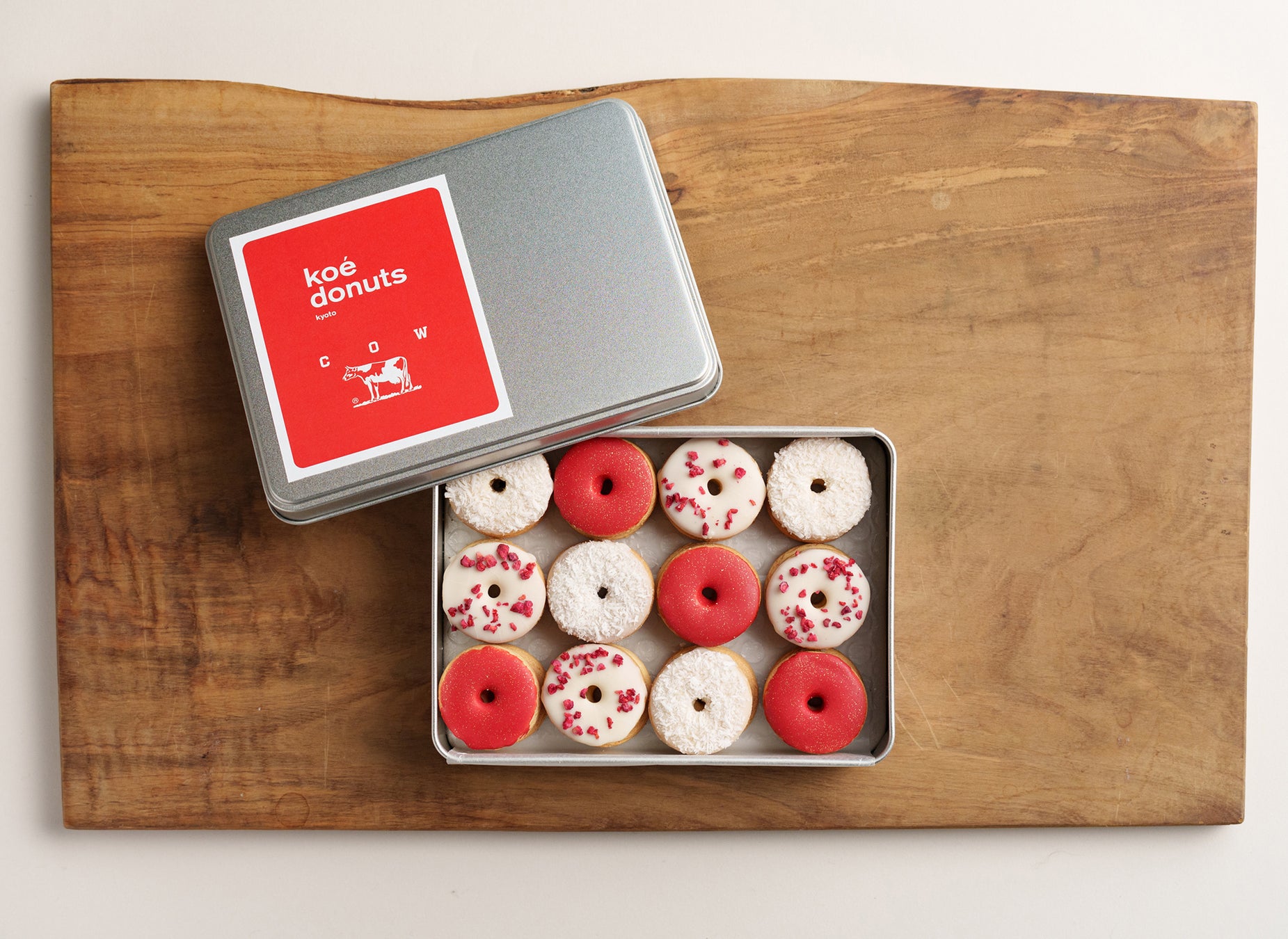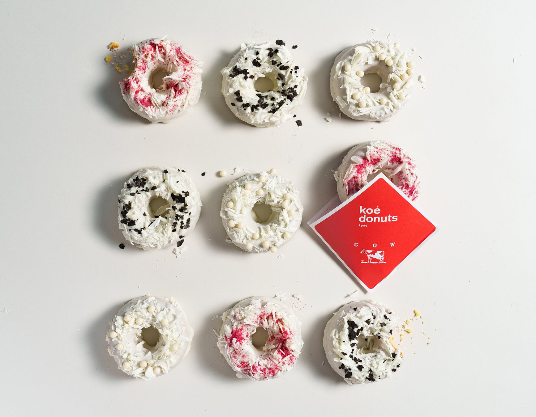 今回は、老舗石鹸ブランド「カウブランド赤箱」の石鹸にもミルクバターが採用されていることをきっかけに、初のコラボレーションが決定。ミルクバターをメインにしたドーナツ生地を開発し、ロゴや牛柄、ふわふわの泡をイメージした3種類を揃えた。コラボドーナツは、焼きドーナツをホワイトチョコで真っ白にコーティングし、その上にココアをまとったフィアンティーヌやラズベリー、ホワイトチョコをトッピング。ドーナツを包むパッケージも特別仕様で、赤箱の世界観をkoe donutsらしく表現した。