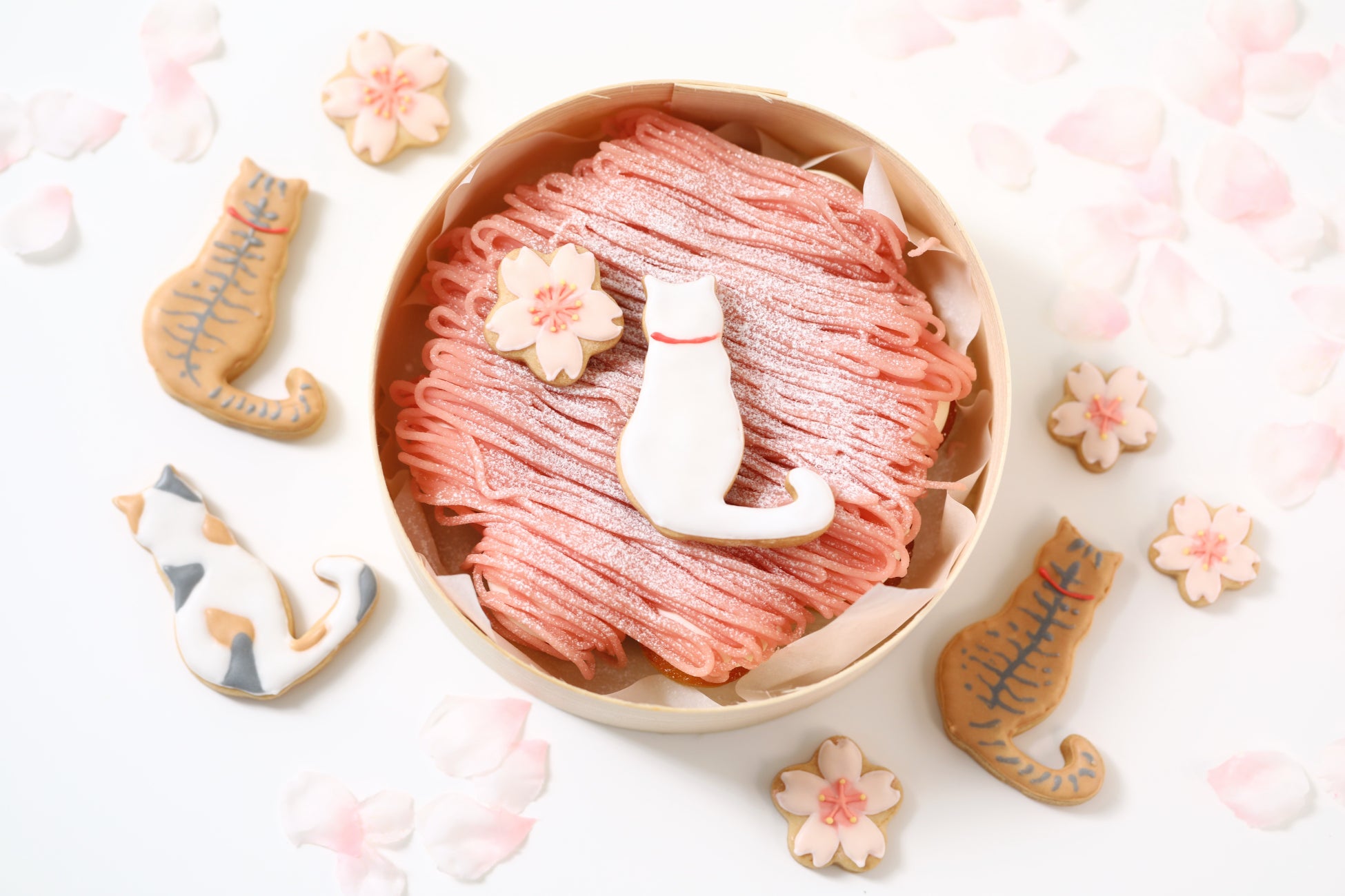 2月22日の猫の日に合わせて、猫のアイシングクッキーを飾り付けした「さくらのプチモンブラン ~ねこVer.~」も用意。どの柄の猫に出会えるかは店舗でのお楽しみ。