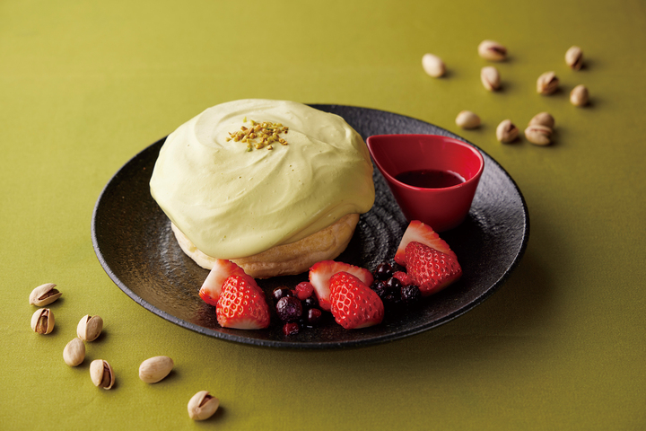 「ピスタチオとベリーのパンケーキ」は香ばしいピスタチオクリームに甘酸っぱいベリーがアクセント。お好みでストロベリーソースをかけて食べられる。「ピスタチオモンブラン」はクッキー生地にホイップクリームとピスタチオ餡のモンブランケーキだ。