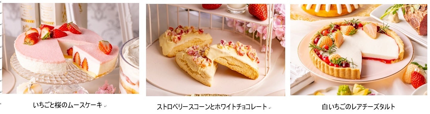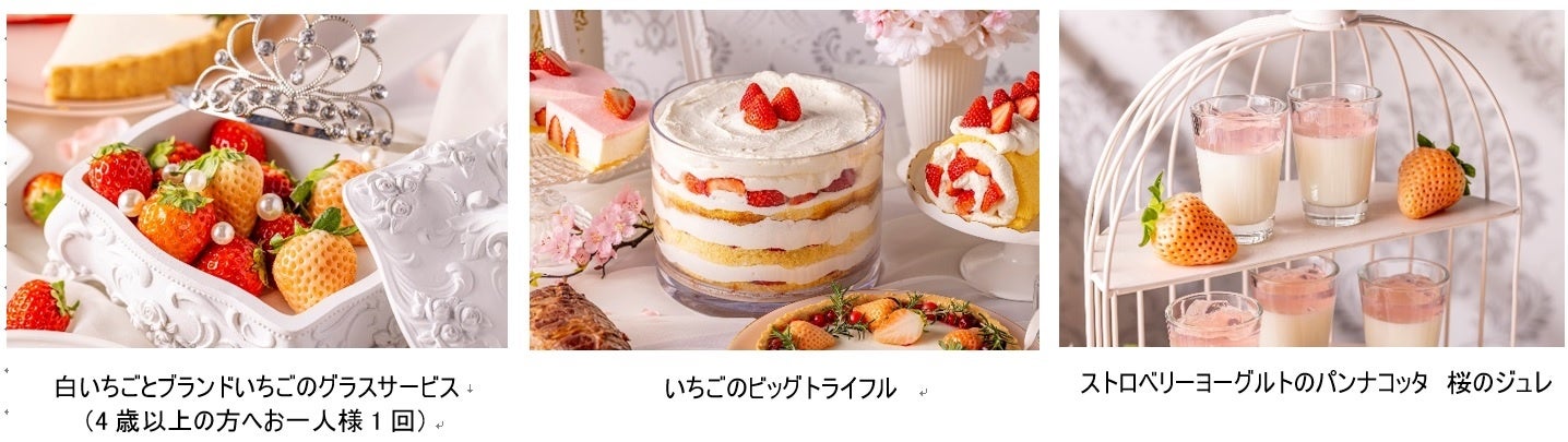 大きなガラスの器にスポンジと生クリーム、いちごを三層に重ねた「いちごのビッグトライフル」やパンナコッタに淡いピンクのジュレをのせた「ストロベリーヨーグルトのパンナコッタ 桜のジュレ」、「いちごと桜のムースケーキ」はムースの中にホールのイチゴを入れ、断面が美しく見えるようカットされている。イチゴのおいしさを引き立てるシェフのオリジナルデザートを堪能できる。
