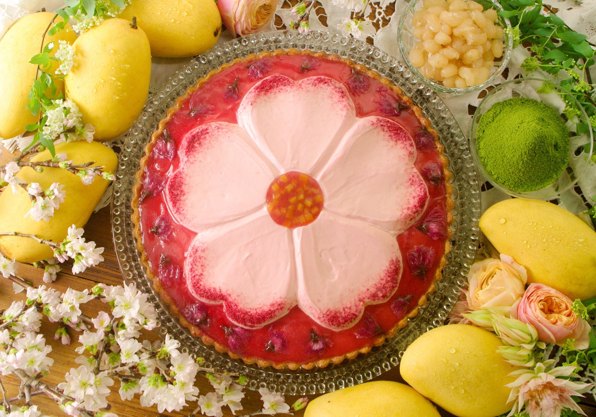 東京スカイツリータウンでは、桜風味のクリームを使用したタルトや日本らしい桜の和柄が施されたうちわ飴など、見ても食べても春を感じられるスイーツを提供。浅草と東京スカイツリータウン間に位置する複合商業施設・東京ミズマチでも、春限定メニューがお目見えする。
