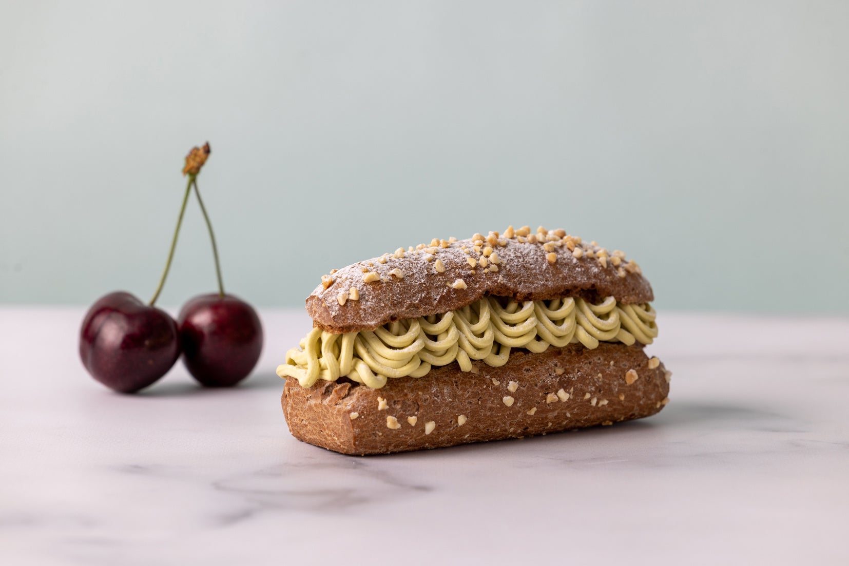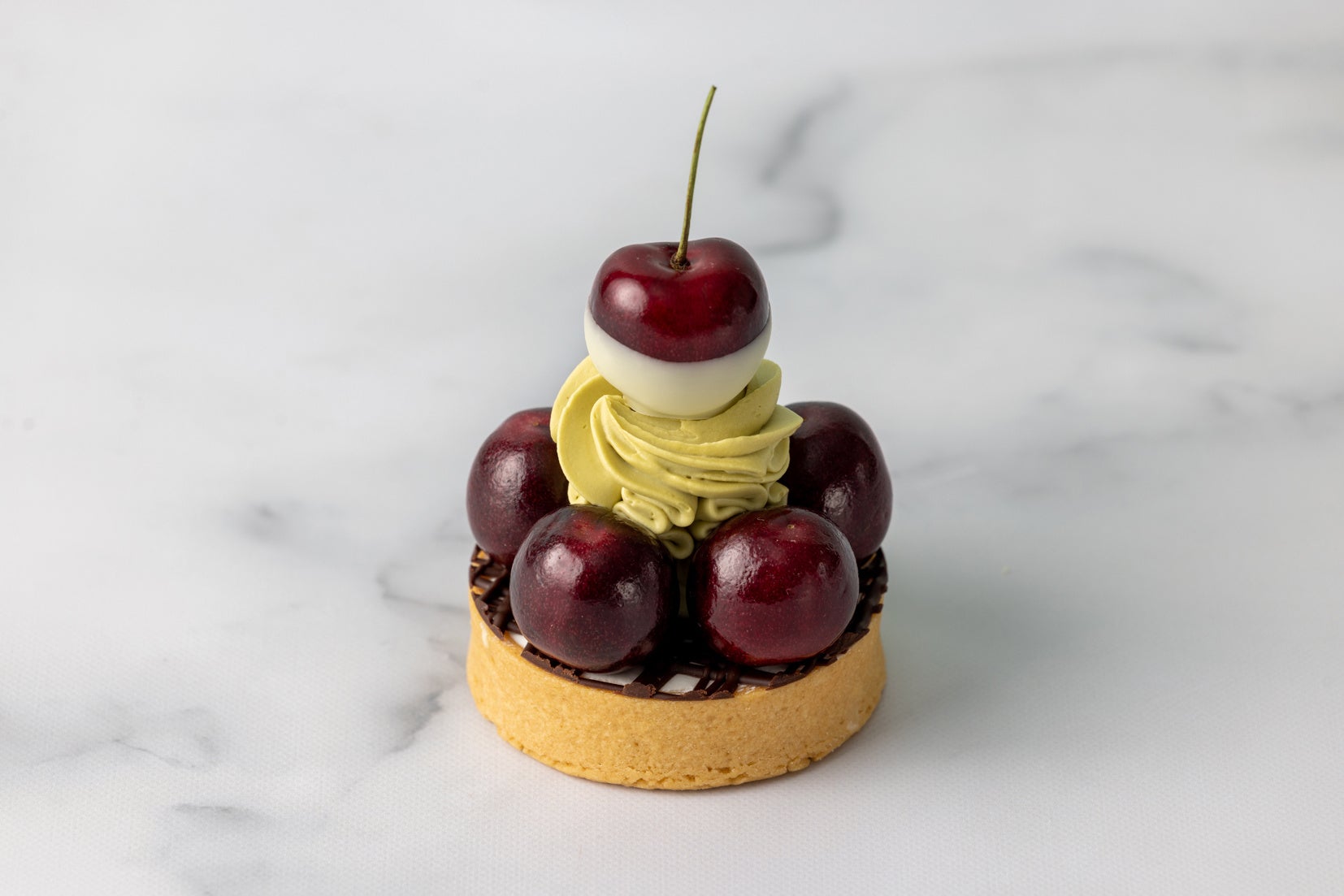 今年は2種類の新作を含めた計4種類のスイーツが勢揃い。ピスタチオが香るホワイトチョコレートのクリームや、カスタードクリームと生クリームを合わせた濃厚でリッチな味わいのディプロマットクリームを挟み、重層的な味わいが広がる新作の「チェリーエクレア」、タルト生地にピスタチオのガナッシュを詰め、フレッシュチェリーを乗せた「チェリータルト」が新たに仲間入り。