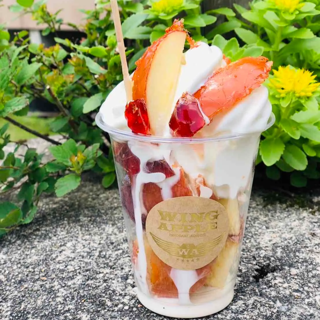看板商品の「りんごあめ」と濃厚ソフトクリームを組み合わせたパフェ。