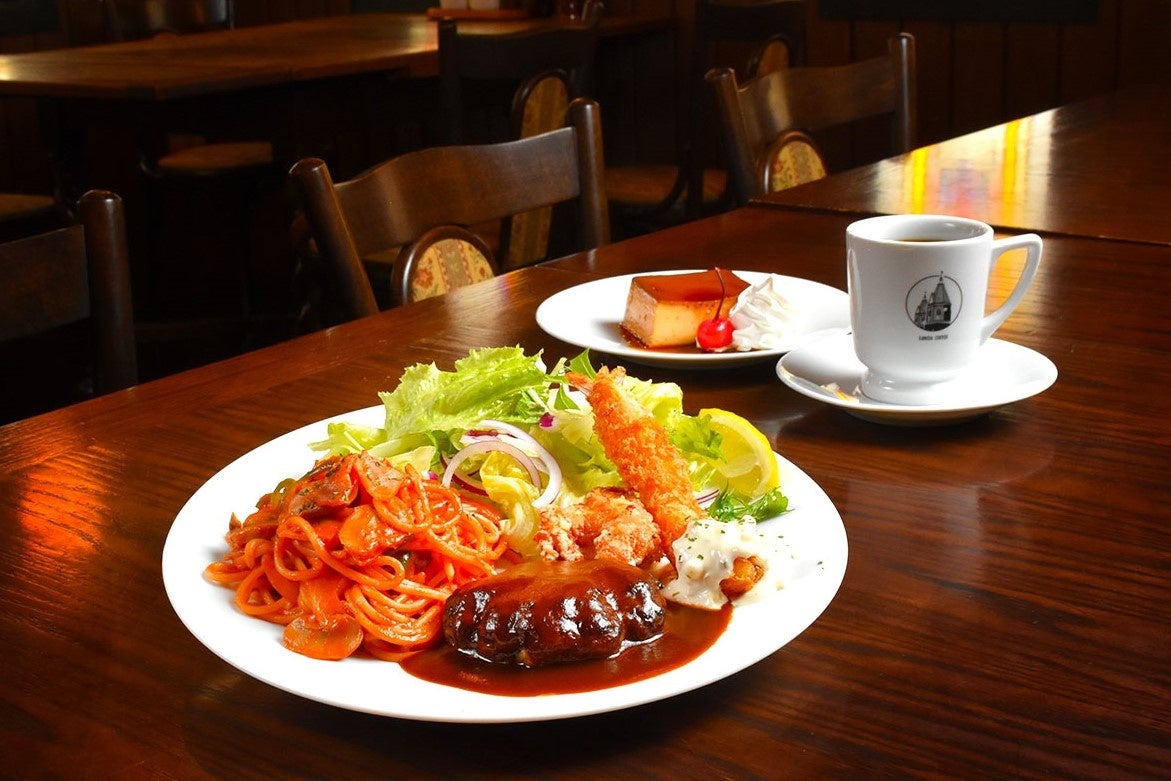 食事メニューの「大人様プレート」は子どものころ憧れたハンバーグ、ナポリタン、エビフライ、唐揚げなど大人も満足のおいしさとボリュームに仕上げた。