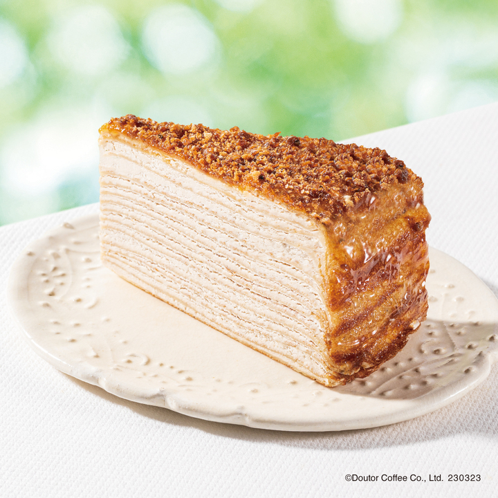 「ブリュレ仕立ての黒糖ミルクレープ~沖縄県産黒糖使用~」は、人気のミルクレープを黒糖風味にアレンジ。黒糖風味のホイップクリームを挟み、黒糖の風味とまろやかな味わいを楽しめる。天面には、グラニュー糖を振りかけてブリュレし、その上に砕いたかりんとうをトッピングした。なお数量限定のため、商品がなくなり次第販売を終了する予定。