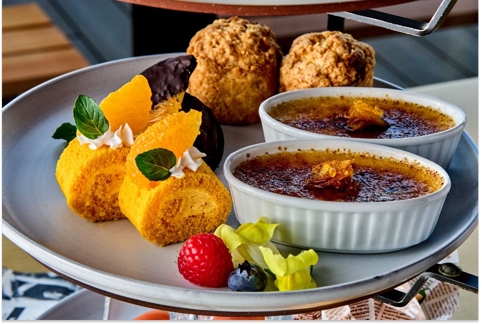 中段はイチゴと好相性のオレンジを用いたメニューが並ぶ。芳醇な香りと甘みに富んだバレンシアオレンジをチョコレートで包んだ「オランジェット」、オレンジが香る「クレームブリュレ」の他、サクホロ食感の「ホワイトチョコのスコーン」も楽しめる。