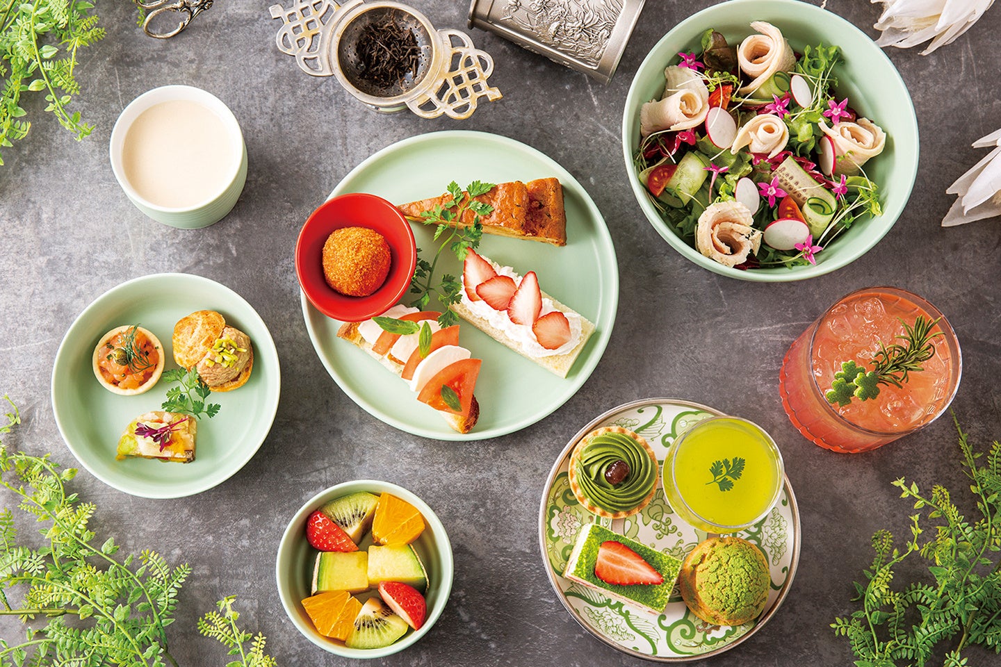 旬のフルーツをのせた「壱の段」からはじまり、フランス料理のアミューズとして有名なグージェール(チーズ風味のシュー生地)にリエットを挟んだ「グージェール リエット」や、「野菜のゼリーテリーヌ」などプティオードヴルの「二の段」、ラディッシュやエディブルフラワーが鮮やかな「彩りサラダ」の「参の段」、旬の果物を自家製パンにサンドした「フルーツサンド」などオードヴルの「四の段」。そして、初夏をイメージした抹茶スイーツ4種のプレートを用意している。