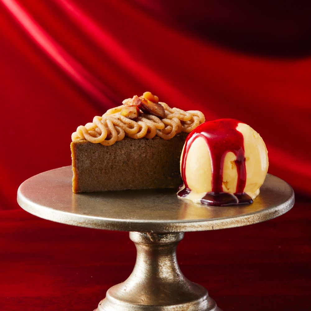 別添えのカシスソースをかけると、栗とほうじ茶の深い味わいに酸味が加わり、爽やかな印象に。チーズケーキのみはもちろん、カシスソースやバニラアイスと組み合わせても楽しい、濃厚スイーツに仕上げた。