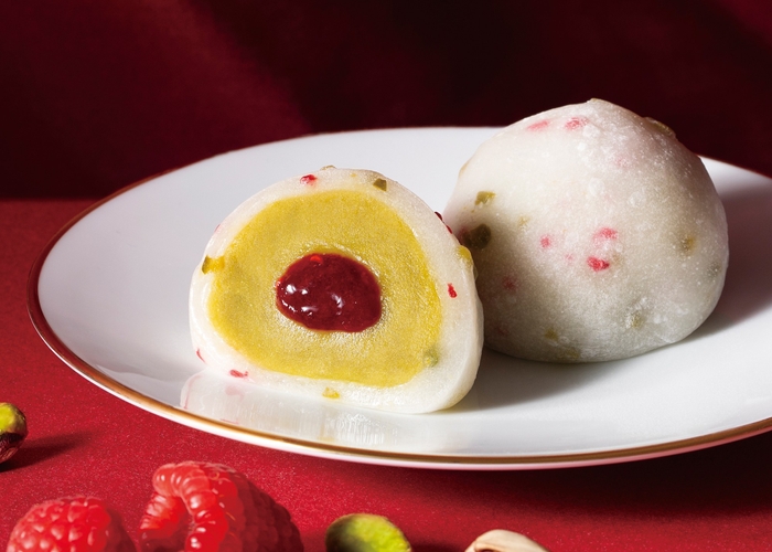 やわらかな食感の羽二重餅にはピスタチオとフリーズドライのフランボワーズを加えており、普通の大福とは一味違う食感が楽しめます。そこに、濃厚なピスタチオ餡と甘酸っぱいフランボワーズソースが合わさったクリスマスにもぴったりの大福です。