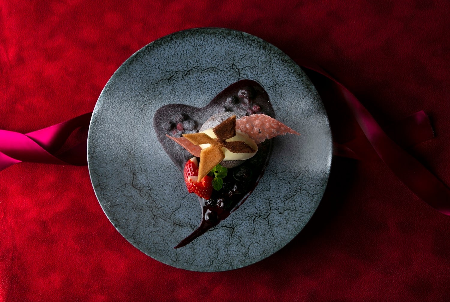 「- kurenai -」はビターなチョコレートケーキの中から濃厚なガナッシュがとろけ出るフォンダンショコラに、ブラックベリー・ブルーベリー・ラズベリーなどの果実味が凝縮したベリーソース、バニラアイスクリームを添えた。ハートの形のベリーソースとストロベリー、クロスのラングドシャなどビジュアル面も注目だ。
