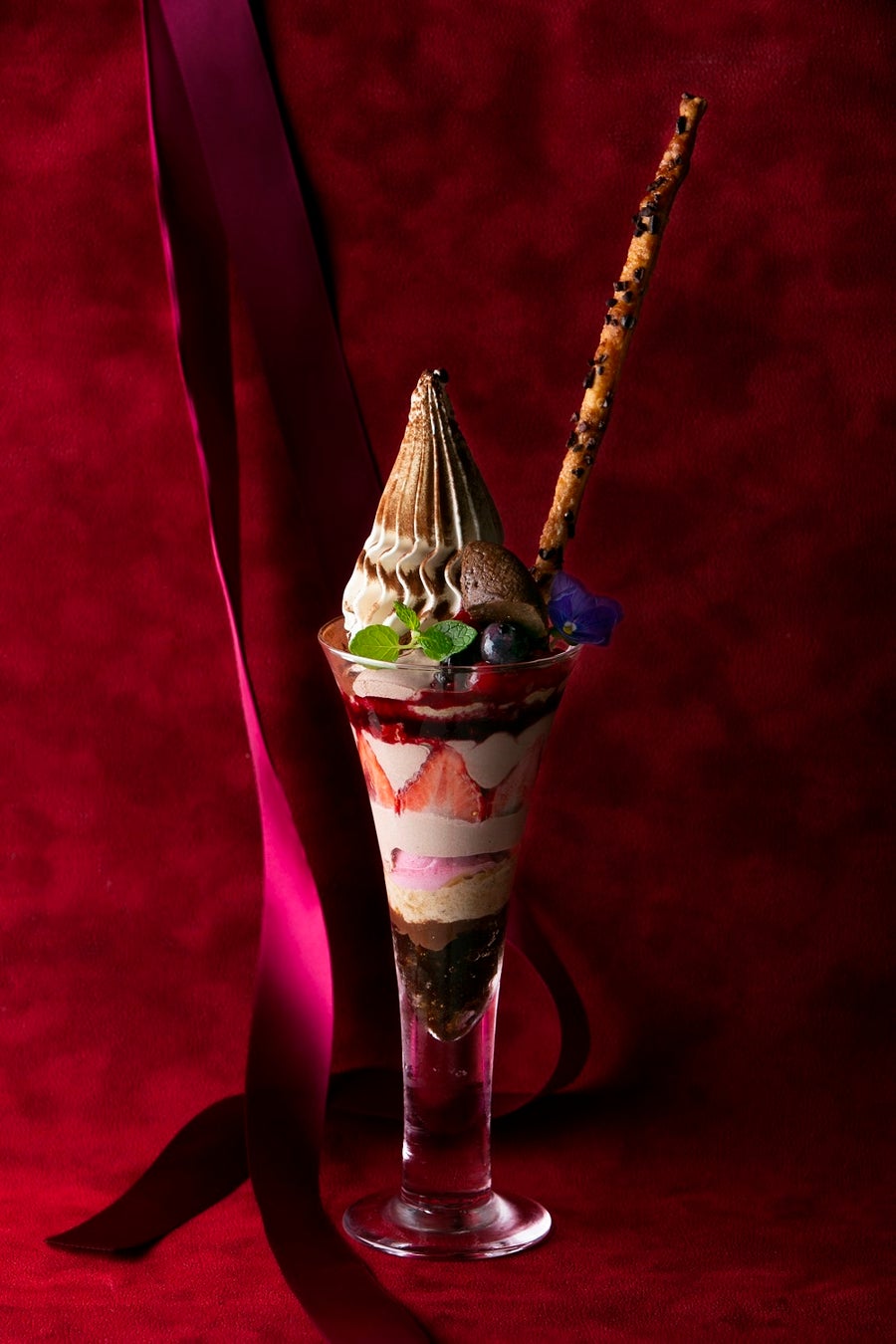 宝石などを入れる小箱を意味する「コフレ」。「コフレ・ド・ショコラ」はパフェグラスにチョコレート、プレミアムソフトクリーム、ストロベリー、ベリー、コーヒー、その他赤ワインやカシスのソースなどを宝箱のごとく詰め込んだ。コーヒーゼリーは「TRUNK COFFEE」の焙煎豆から抽出したコーヒーを採用するなど、細部にまでこだわっている。
