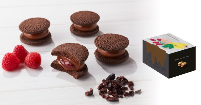 「キャラメルムーンショコラフランボワーズ」は、ココアクッキーとフランボワーズソース、濃厚なキャラメルでほろ苦くて甘酸っぱいコクのある味わいが口の中に広がるシーズン限定のサンドクッキーだ。