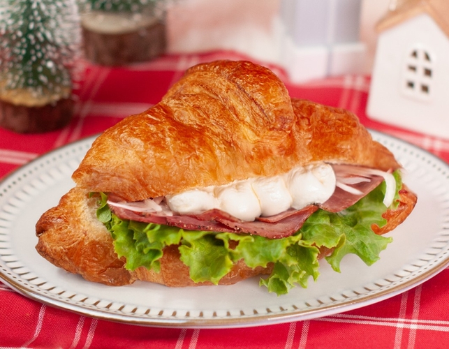 商品特徴:サクサクのクロワッサンにパストラミビーフとシャキシャキ野菜、クリームチーズをサンド。ちょっと贅沢なクリスマスランチにぴったり!