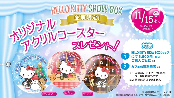 詳細: HELLO KITTY SHOW BOXのカフェ公演へのご来場、またはショップエリアにて5500円以上をお買上げ毎に、本施設限定デザインのアクリルコースターをプレゼント
