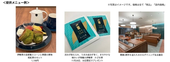 フェアでは、三重県産伊勢茶を使用した自家製スコーンを提供します。また、11月29日(土)、30日(日)の2日間、各日先着150名様に三重県北勢地域で生産がさかんな「伊勢茶 かぶせ茶ティーバック」をプレゼントします。(無くなり次第終了となります。)
