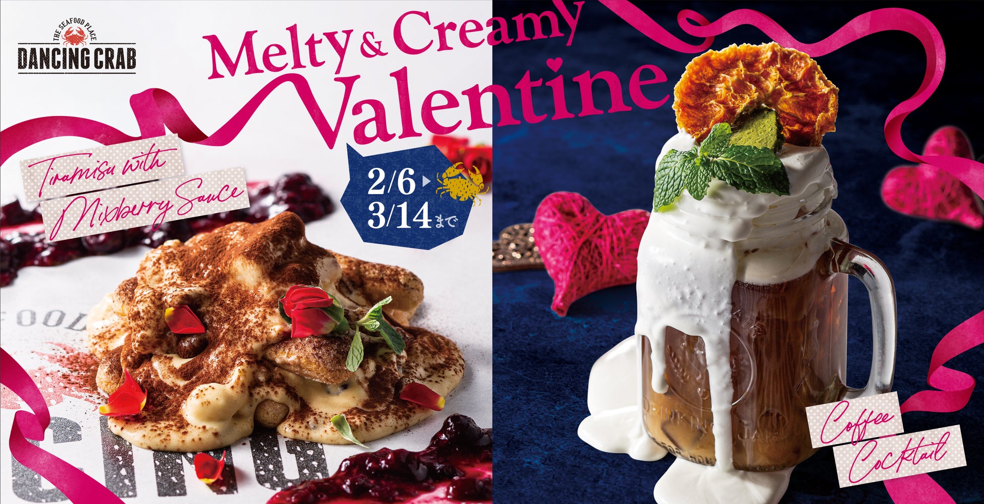 東京都および大阪府で展開するシーフードレストラン「DANCING CRAB」は2月6日〜3月14日、クリーミーでとろける食感をテーマに、マスカルポーネチーズ&生クリームのとろっとクリーミーな生地の「ラム酒香る大人のティラミス」と、コーヒーリキュールにオレンジが香るクリームをたっぷりかけた「ビター&スウィートなマリア・テレジアコーヒーカクテル」を提供する。