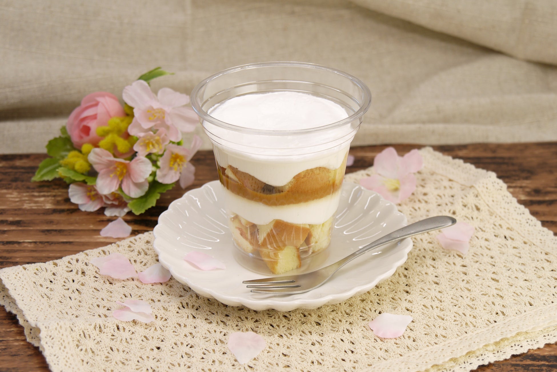 「クリームINシフォン~北海道産純生クリーム使用~」は、ふわふわのシフォン生地を敷きつめた上に北海道産純生クリームのホイップクリームとビターカラメルカスタードソースを重ね、ボリュームたっぷりに。シフォン生地とホイップクリームの好相性のカップスイーツだ。