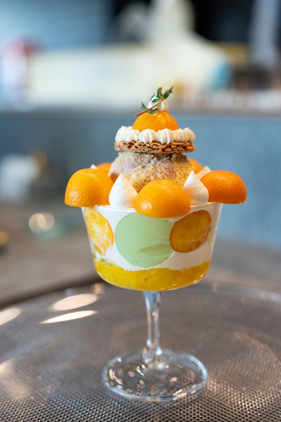 「金柑と紅茶のパフェ」は、旬の金柑と八朔を使用したパフェ。金柑はグローブというスパイスを使用してコンポートした。ほろ苦い皮と上品な甘さの果肉を紅茶のジェラートとともに食べられる。
