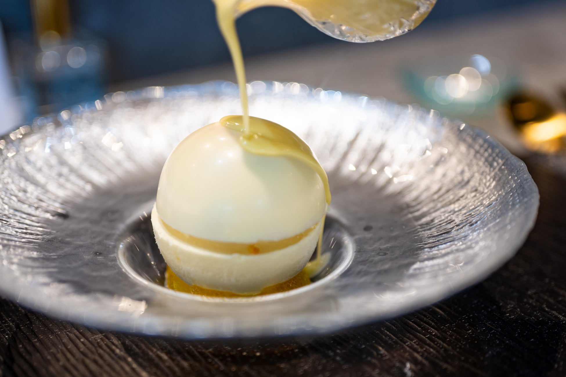 「ムースショコラブラン・オランジュ」はオレンジ香る爽やかなホワイトチョコのムースと紅茶のソルベのマリアージュ。温かいホワイトチョコとオレンジのソースをかけて食べられる。
