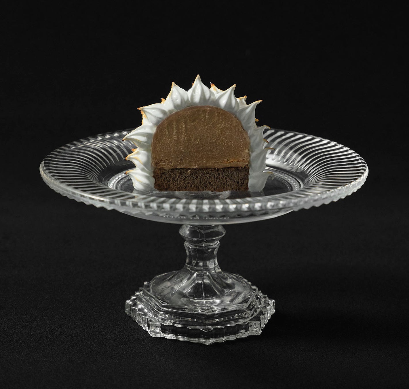 「《炎のデザート》ベイクド・アラスカ」は、冷たいジェラートを真っ白なメレンゲでデコレーションし、ラム酒でフランベした米国の伝統的デザート。今回はとろけるような純白のイタリアンメレンゲと濃厚な自家製「香るティージェラート」、フワフワの「台湾カステラ」を三層に重ね、仕上げに炎のラム酒でフランベしている。