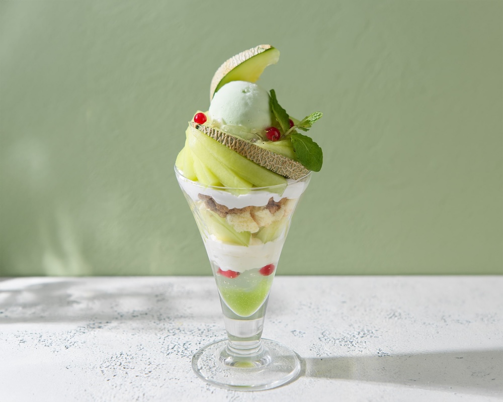 「アンデスメロンのパルフェ」は、レモンシュトロイゼルで食感と爽やかな風味にアクセントを添え、鮮やかな赤色のグロゼイユをあしらい色味と酸味のアクセントに、さっぱりとしたレモンジュレを合わせた。さらに練乳プリンと練乳アイスの優しくまろやかな甘さで、茨城県産のアンデスメロンの味わいを一層引き立てる。価格は税込み1,540円。