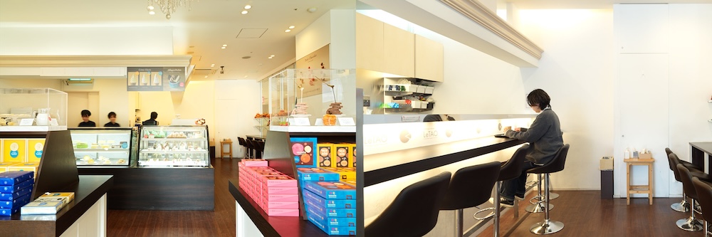 イートインスペースを併設し、エキモ店限定品のシュークリームやロールケーキを、ドリンクと一緒に楽しめる。