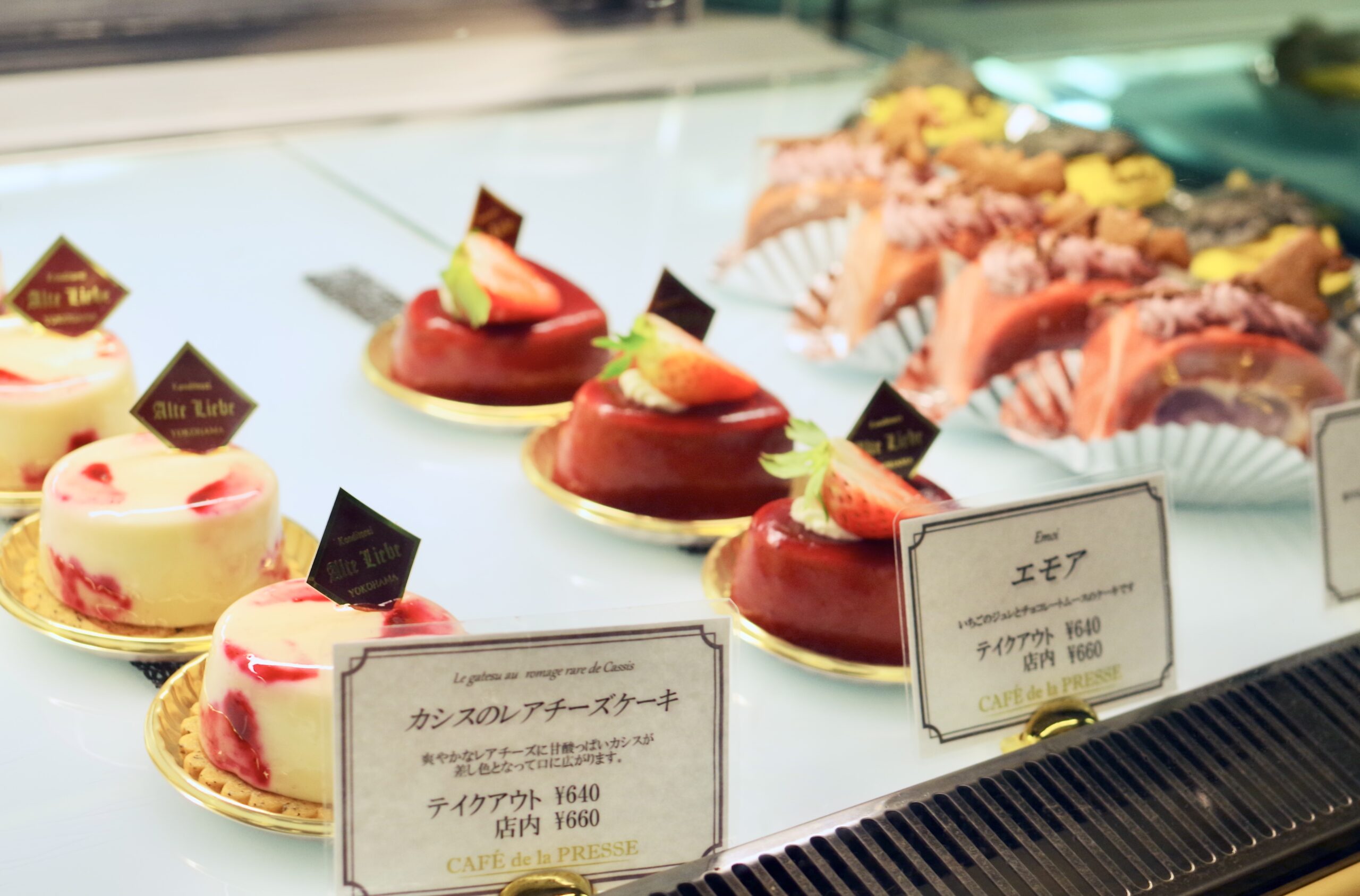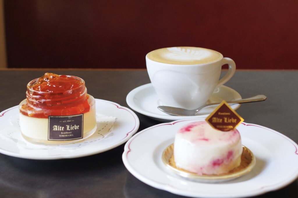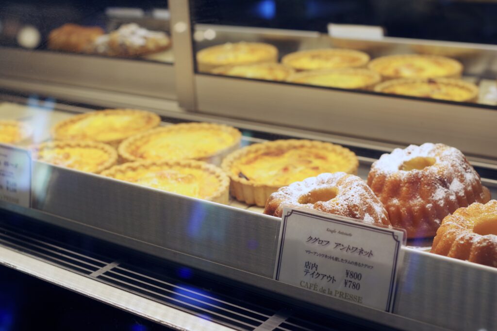 店前にはパティシエが手掛ける本格的な生仏菓子や焼き菓子などが美しく並んでいる。なお、1階には生演奏が楽しめる仏料理の「アルテリーベ横浜本店」も併設している。「アルテリーベ」と同じパティシエが「カフェ ドゥ ラ プレス」でつくっているという点も注目したい。