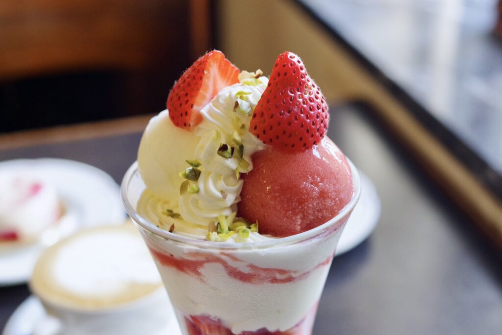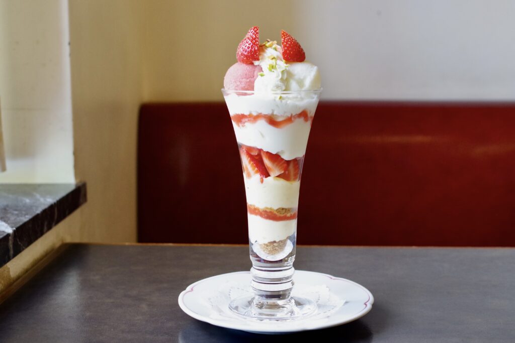 特にほどよい甘みのパンナコッタと、フレッシュなイチゴの酸味のバランスがよい。このほか季節限定のパフェもある。