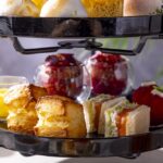 同アフタヌーンティーは、色鮮やかなスイカを閉じ込めたヴェリーヌ、メロンとアニスが香り立つエキゾチックなムース、焼成で甘みを凝縮させたパイナップルとコリアンダーのケーク、さらに南国の酸味がきらめくパッションフルーツのマカロン、涼やかなライムのタルト、五層の桃のケーキ「ペシェ」など7つのトロピカルスイーツが並ぶ。